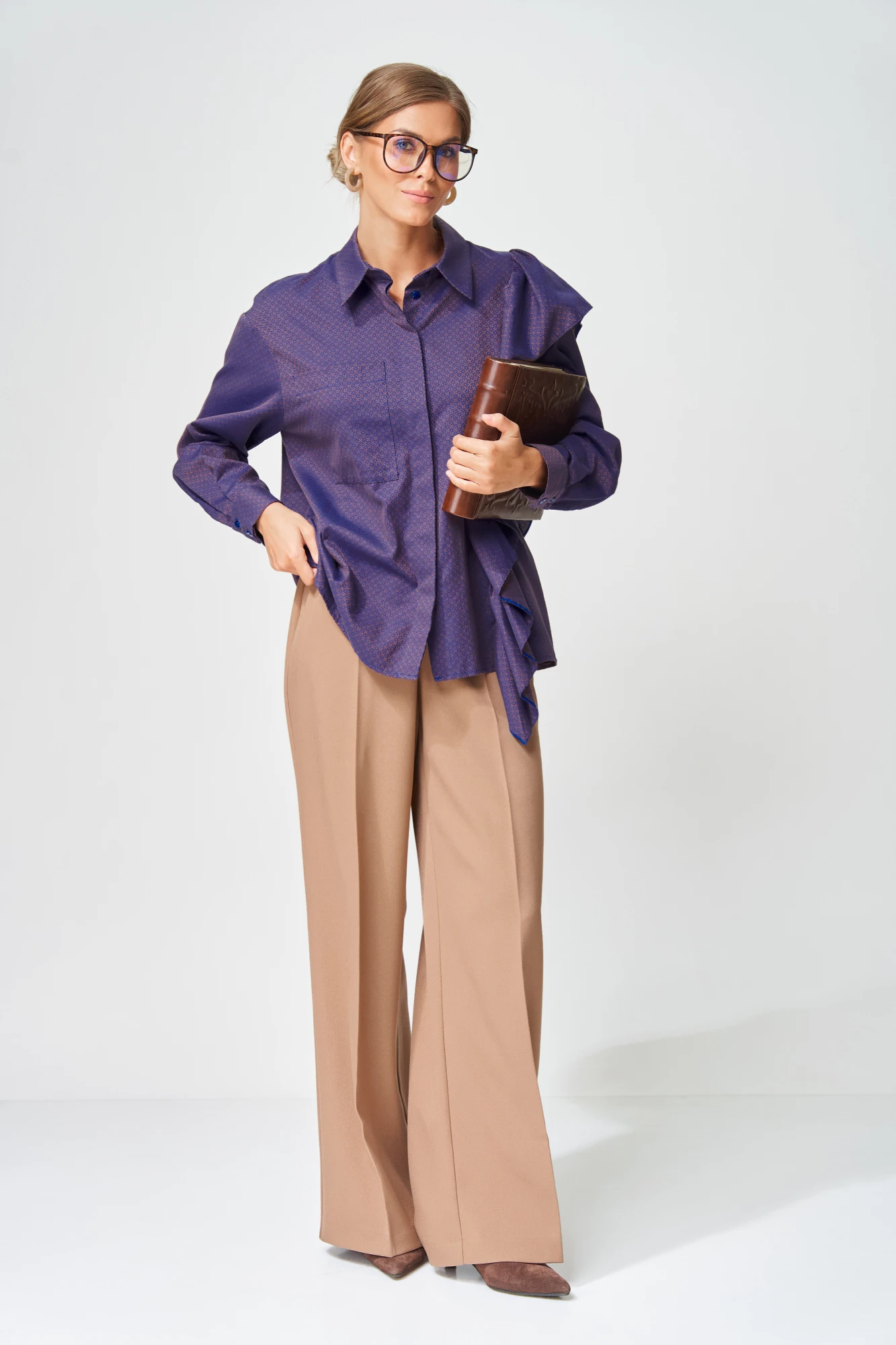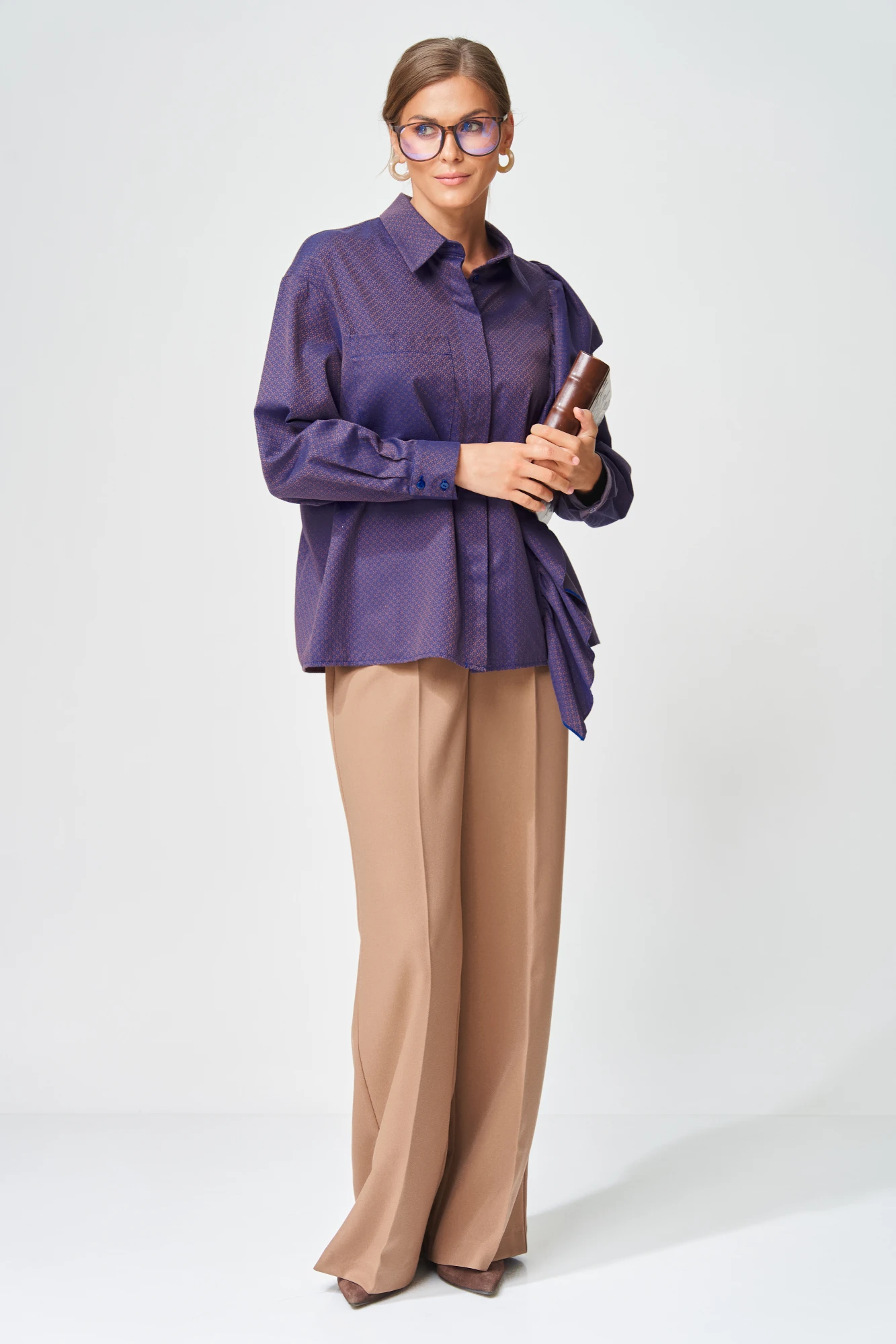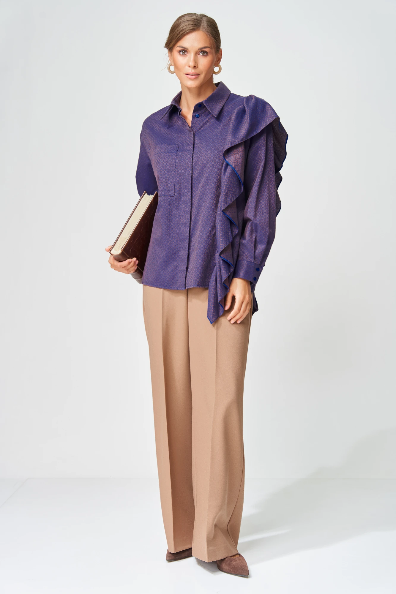 Костюм состоит из блузки (рубашки) и брюк. Рубашка прямого силуэта выполнена из хлопковой ткани с оригинальным жаккардовым переплетением. Перед с центральной застежкой потайной планкой. Левая часть переда и спинка с воланом на сборке вставленном в рельеф. На правой части переда настрочен карман. Рукав втачной одношовный с манжетой по низу, на манжете застежка на 2 петли и пуговицы. Воротник отложной со стойкой. Брюки расширеные книзу с притачным поясом выполнены из костюмной ткани. В поясе по бокам вставлена резинка. По передней и задней частям брюк вытачки и заутюжены стрелки. Спереди застежка гульфик на молнии и пуговицей на поясе. Фурнитура может быть изменена с сохранением художественного образа. Длина рубашки - 65 см, длина рукавав рубашки - 53 см. Длина брюк по боковому шву без учета пояса- 106 см.