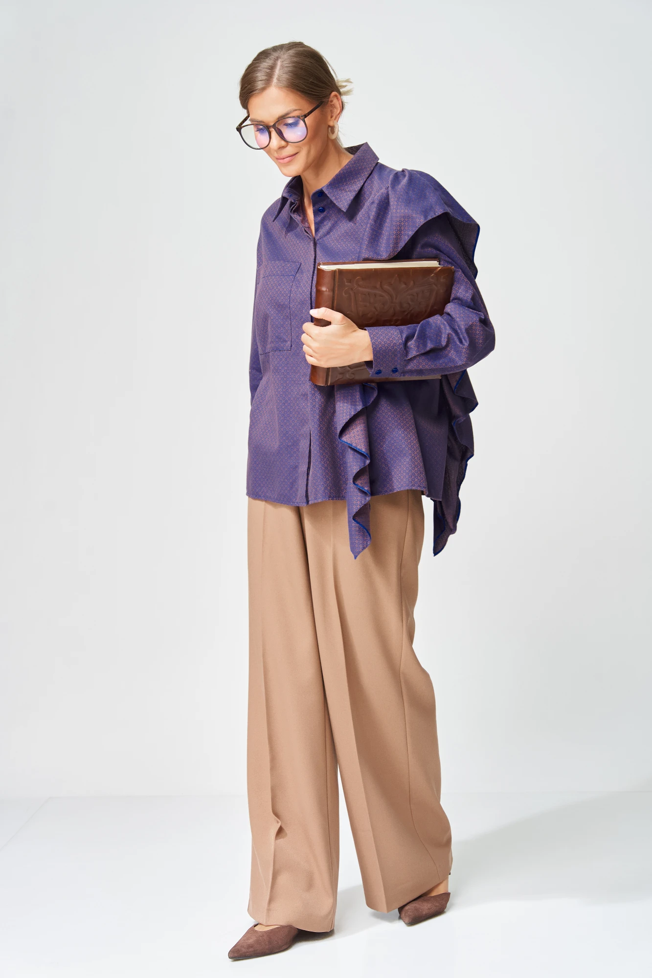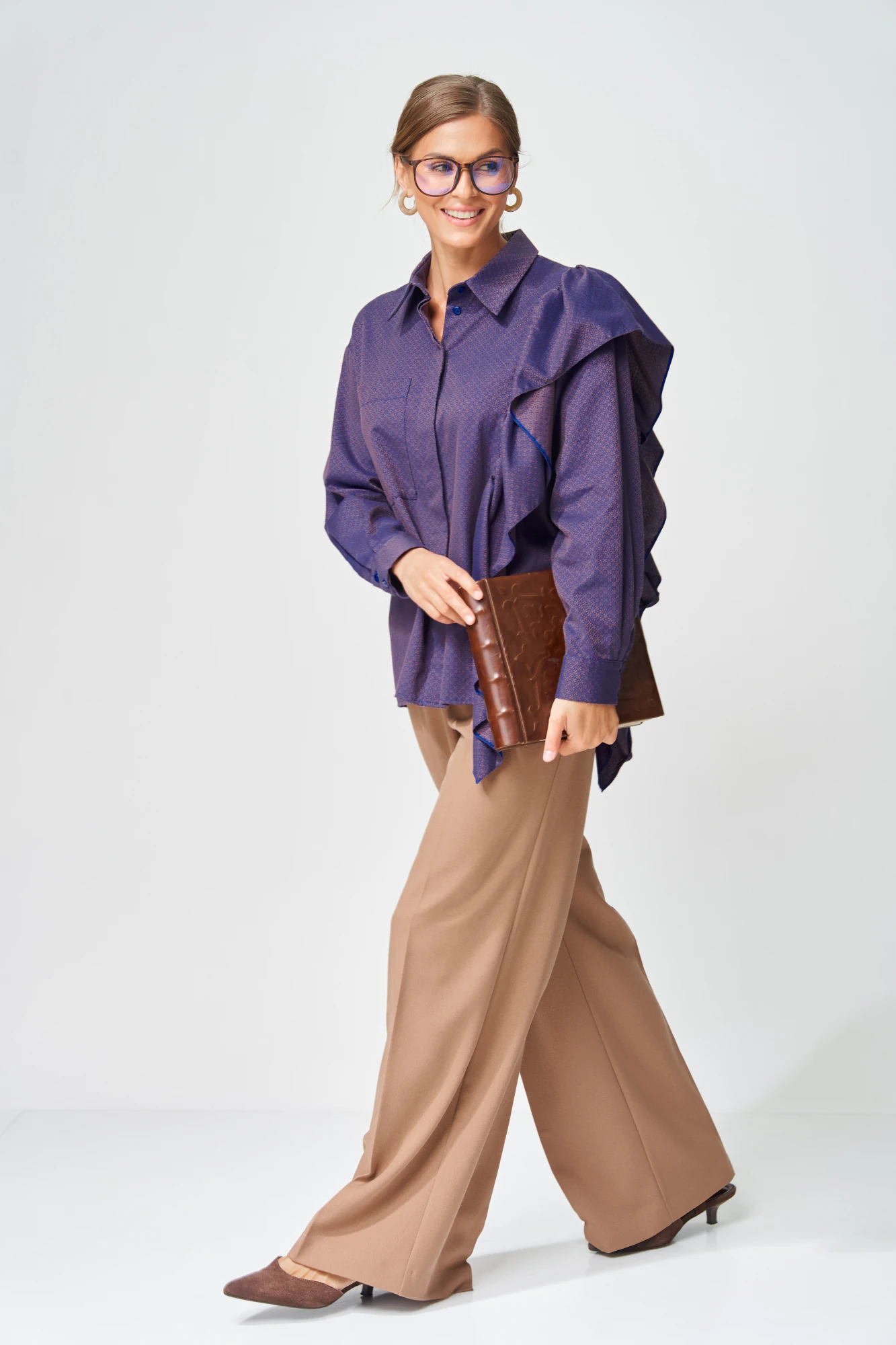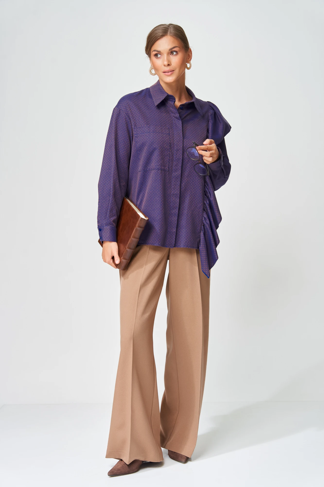 Костюм состоит из блузки (рубашки) и брюк. Рубашка прямого силуэта выполнена из хлопковой ткани с оригинальным жаккардовым переплетением. Перед с центральной застежкой потайной планкой. Левая часть переда и спинка с воланом на сборке вставленном в рельеф. На правой части переда настрочен карман. Рукав втачной одношовный с манжетой по низу, на манжете застежка на 2 петли и пуговицы. Воротник отложной со стойкой. Брюки расширеные книзу с притачным поясом выполнены из костюмной ткани. В поясе по бокам вставлена резинка. По передней и задней частям брюк вытачки и заутюжены стрелки. Спереди застежка гульфик на молнии и пуговицей на поясе. Фурнитура может быть изменена с сохранением художественного образа. Длина рубашки - 65 см, длина рукавав рубашки - 53 см. Длина брюк по боковому шву без учета пояса- 106 см.