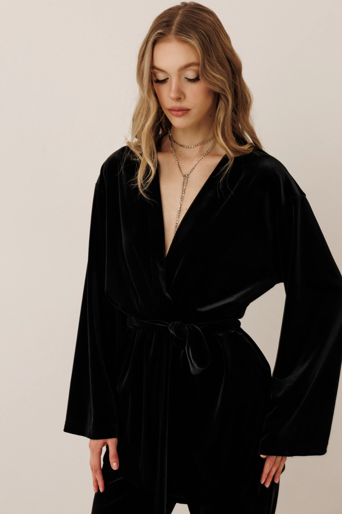 "Самый женственный образ в коллекции от GO - нарядный велюровый костюм! Блузон с запахом и брюки клеш - и вы в центре внимания! Будьте стильными вместе с нами!