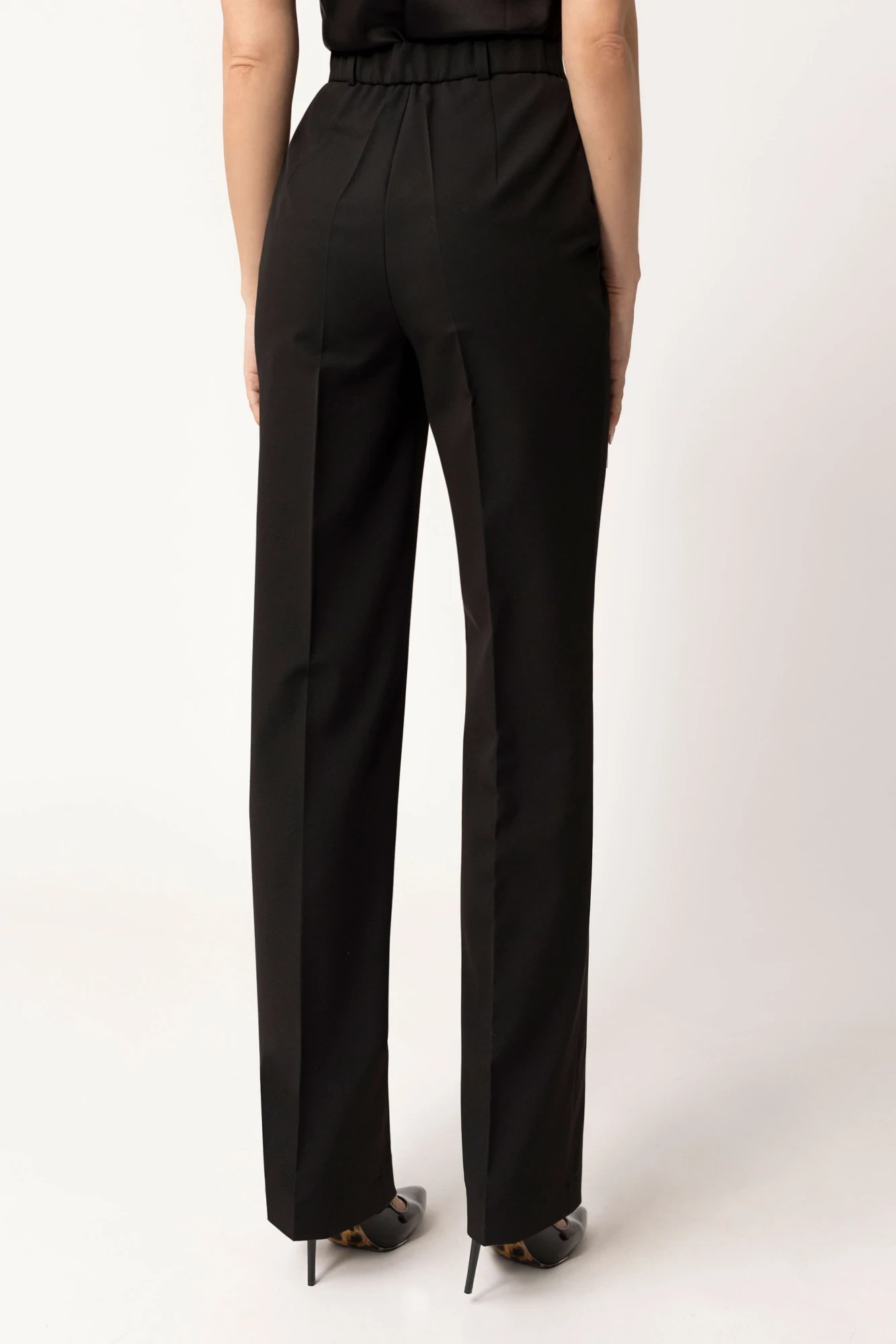 жакет с центральной застежкой на петли и пуговицы, без воротника, с втачной стойкой по спинке. По переду с рельефами, выходящими из проймы и талиевыми вытачками. На левой полочке, на уровне линии груди расположен прорезной карман с листочкой. На уровне линии талии расположены прорезные карманы с клапаном и двумя обтачками. Спинка со средним швом, рельефами, выходящими из проймы. Рукав втачной, длинный. Брюки- с отрезным поясом, на поясе расположены шлевки. По спинке пояс присборен на резинку. По боковым швам расположены карманы. Вход в карман наклонный к боковому шву. Застежка гульфик.