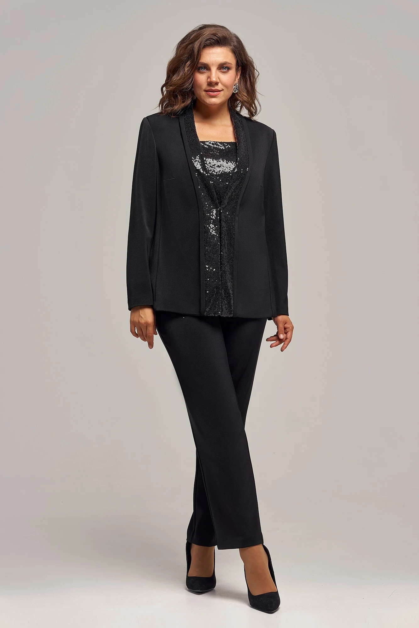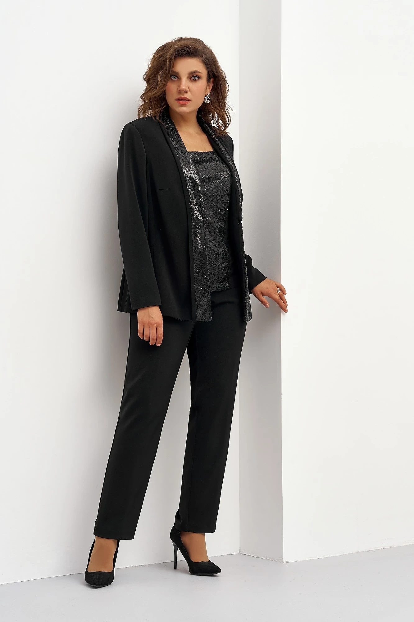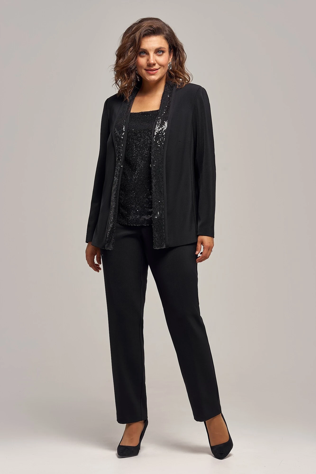 Костюм, состоящий из жакета, топа, брюк. Жакет полуприлегающего силуэта на подкладке, по переду и спинке рельефы, воротник - шаль декорирован отделочной тканью "пайетки", застежка на фигурный потайной крючок.