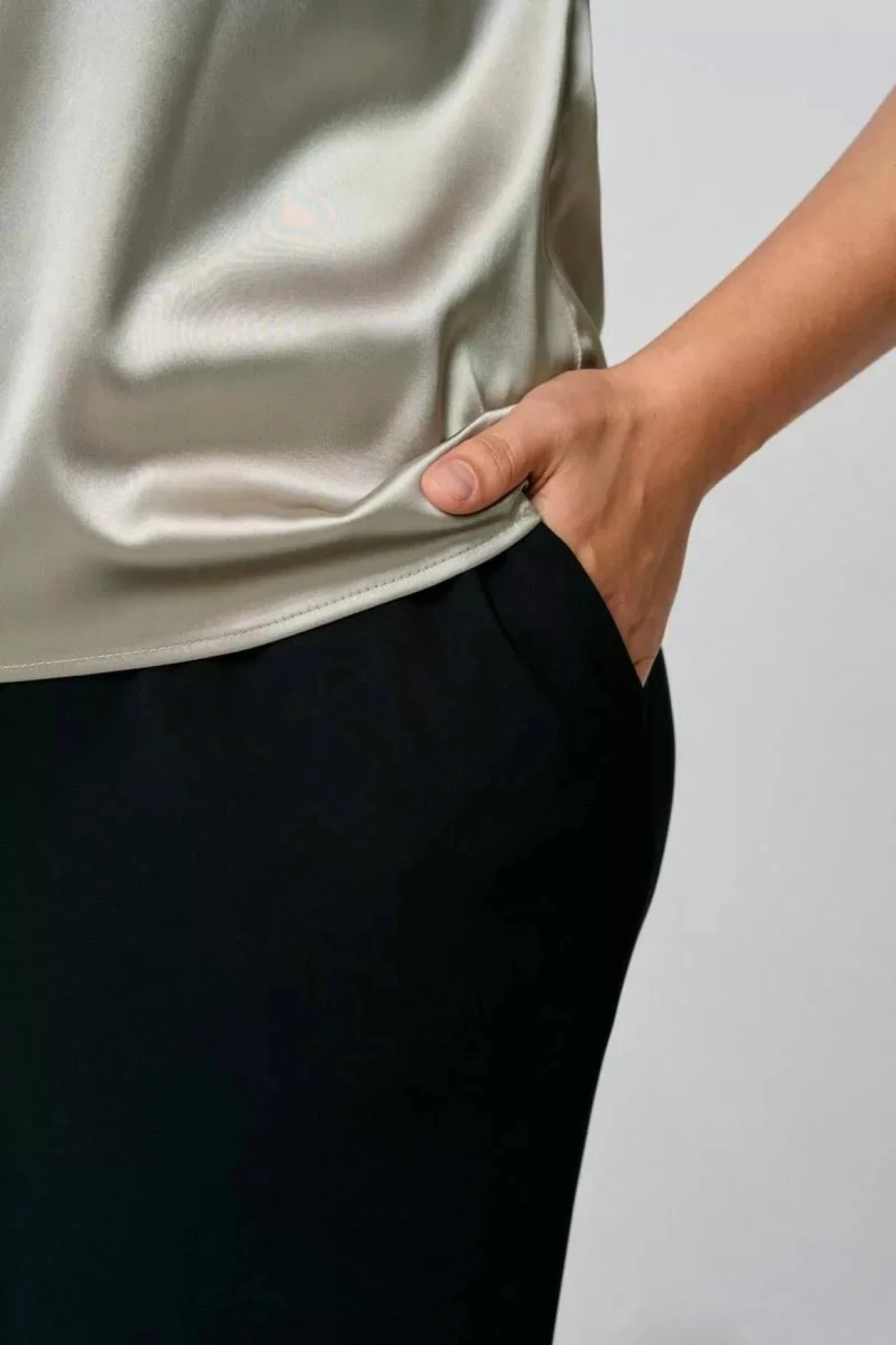 Женский костюм, состоящий из жакета, брюк и топа, выполнен из мягкой струящейся ткани. Удлиненный жакет без подкладки с функциональными карманами по переду и рукавами "летучая мышь". Брюки прямого силуэта с притачным поясом на резинке по бокам, в боковых швах карманы с отрезным бочком, застежка на молнию, петлю и пуговицу. Базовый топ выполнен из мягкой струящейся ткани, рукава со спущенной линией плеча.