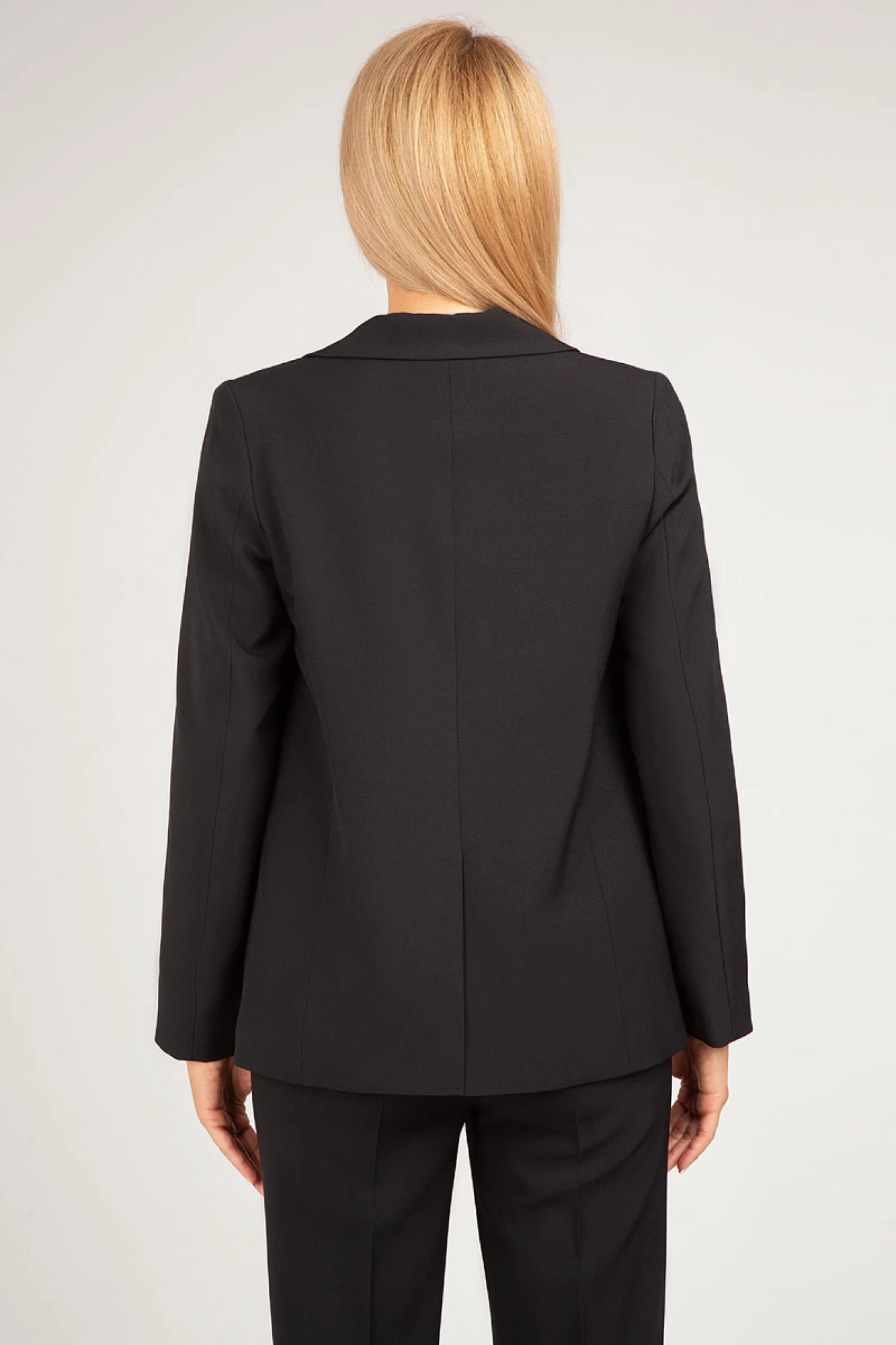 Брючный костюм-двойка. Пиджак полуприталенного силуэта, с однобортной застежкой на пуговицу. Отложной воротник с лацканами. Спереди боковые горизонтальные карманы в рамку. Средний шов спинки заканчивается шлицей. Жакет на подкладке.