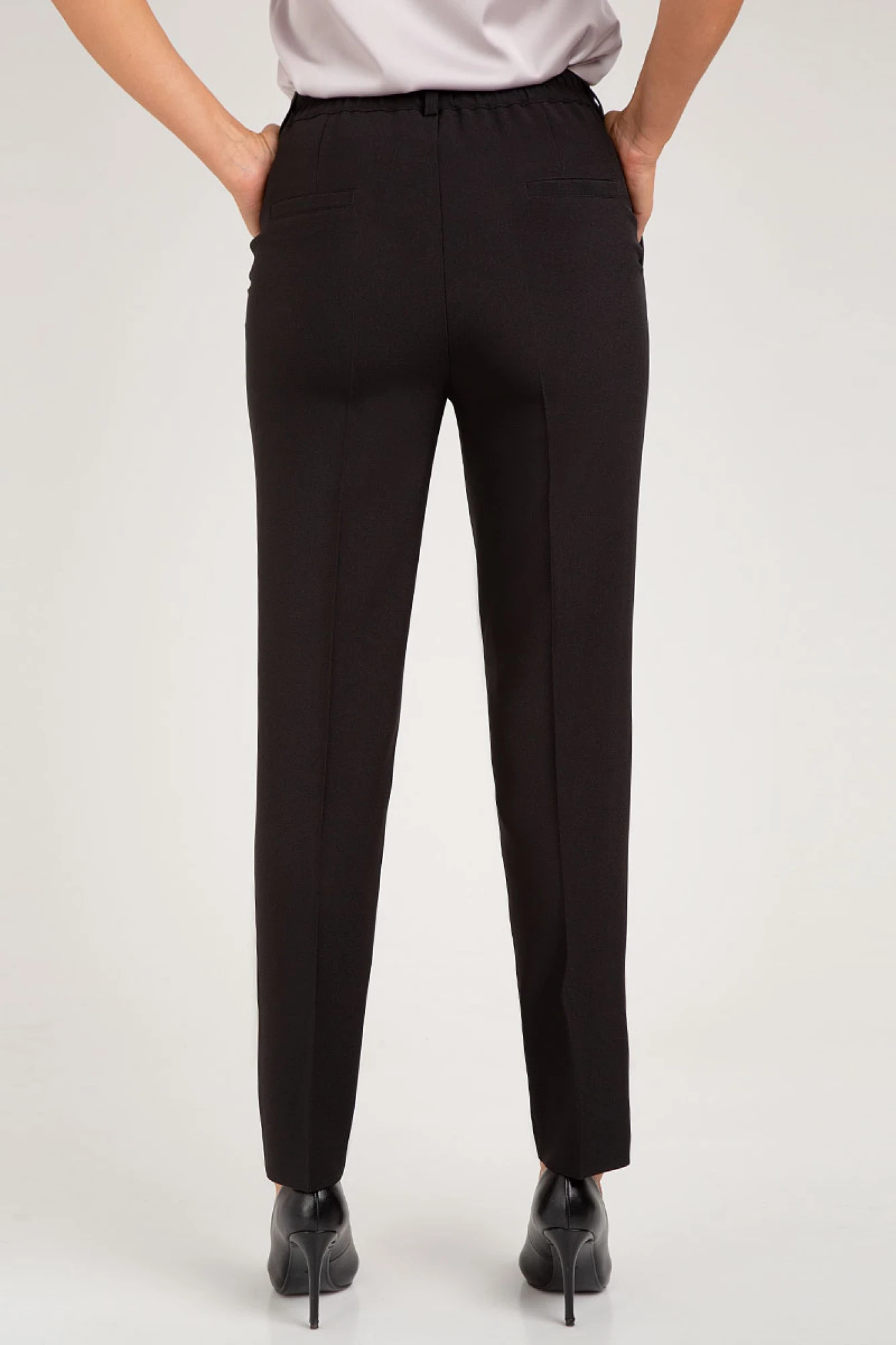 Классические брюки со стрелками, заужены к низу. Притачной пояс со шлевками, по спинке сосборен на резинку. Спереди косые боковые карманы. По спинке имитация горизонтальных карманов с листочкой.
