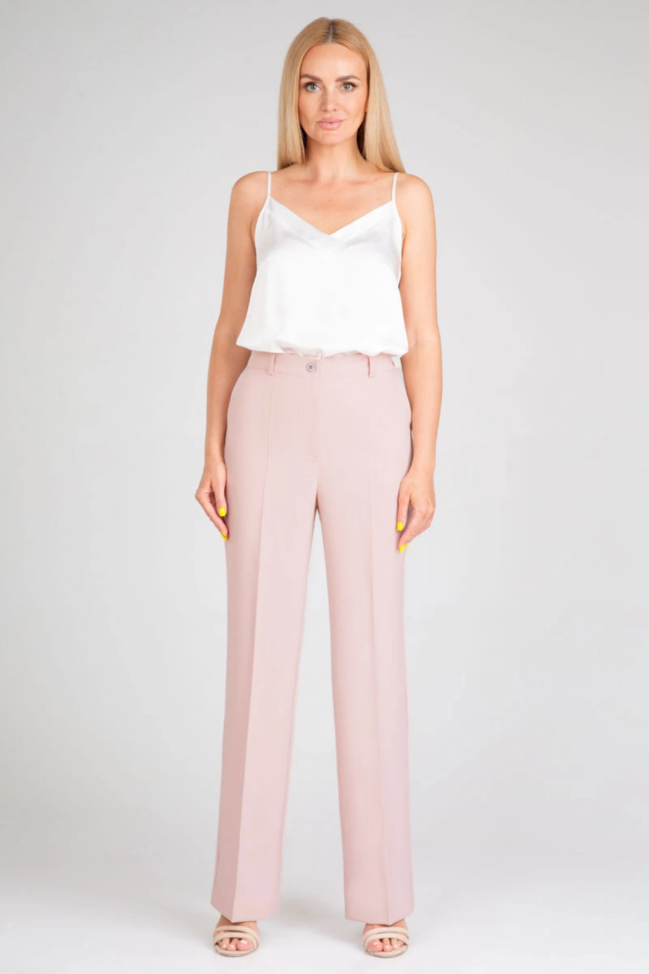 Прямые брюки со стрелками. Высокая посадка на талии. Притачной пояс со шлевками, по спинке сосборен на резинку для комфортной посадки. Застежка на молнию и пуговицу. Спереди косые боковые карманы, по спинке имитация горизонтальных карманов с листочкой.