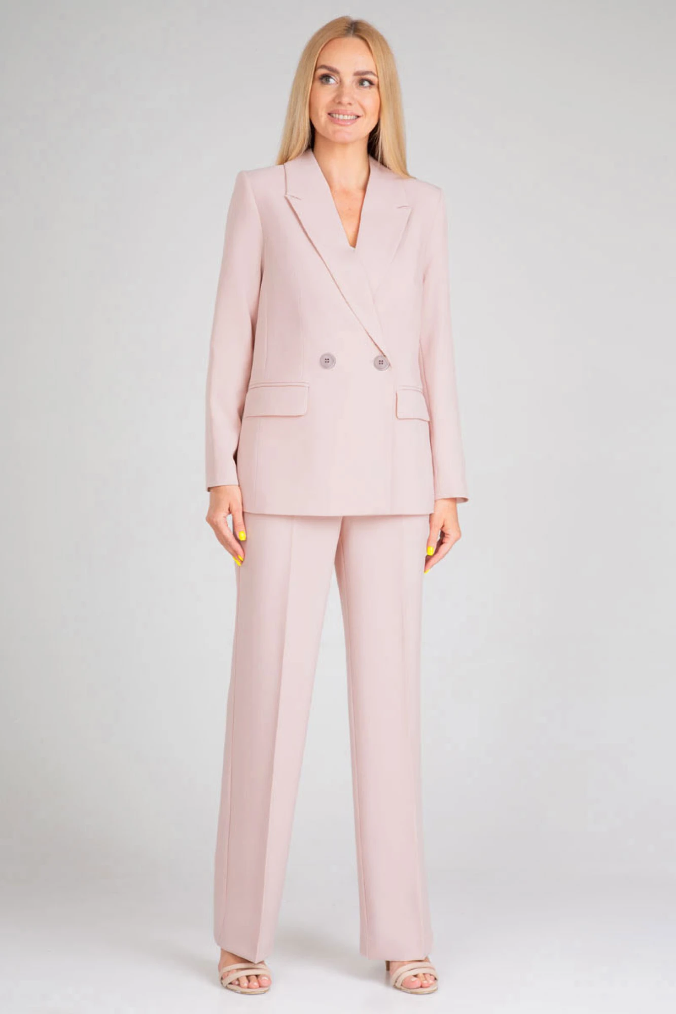 Брючный костюм-двойка. Двубортный жакет полуприталенного силуэта с застежкой на пуговицы. Отложной воротник с лацканами. Перед и спинка с талиевыми рельефами. Спереди горизонтальные карманы с клапанами, в рамку. Спинка со средним швом. Рукава двухшовные. Жакет на подкладке.