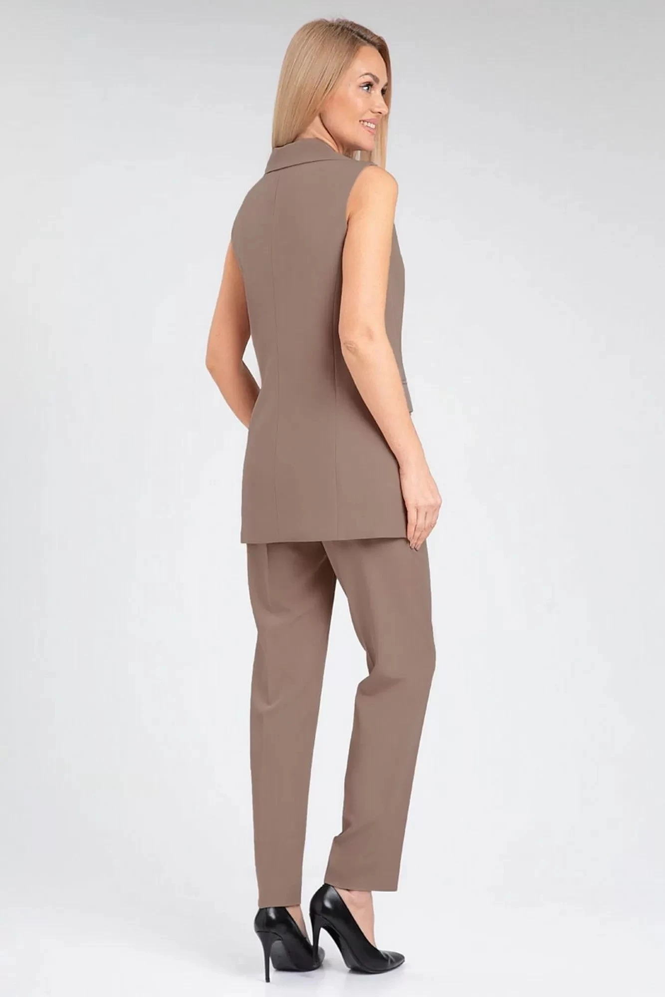 Удлиненный жилет полуприлегающего силуэта с однобортной застежкой на пуговицу. Отложной воротник с лацканами. Жилет с боковыми рельефами, спинка со средним швом. Спереди горизонтальные боковые карманы в рамку, с клапанами.