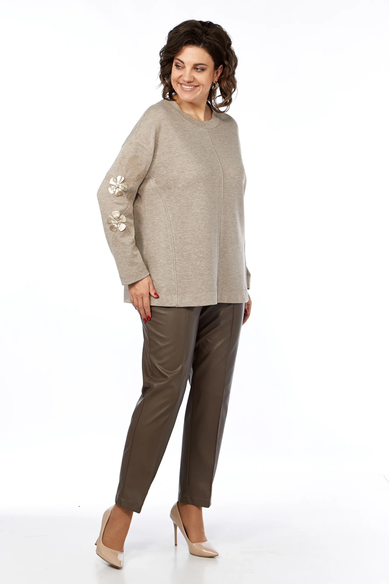 Комплект брючный, состоит из джемпера и брюк. Джемпер свободного силуэта, выполнен из трикотажного полотна. Горловина обработана планкой. Перед с центральным швом и боковыми рельефами, которые декоративно отстрочены. Рукава спущенные декорированы вышивкой с отлетными цветами. Брюки средней посадки, выполнены из экокожи. Пояс притачной на резинке. На передних деталях застрочены стрелки. В брюках обработаны боковые карманы.
