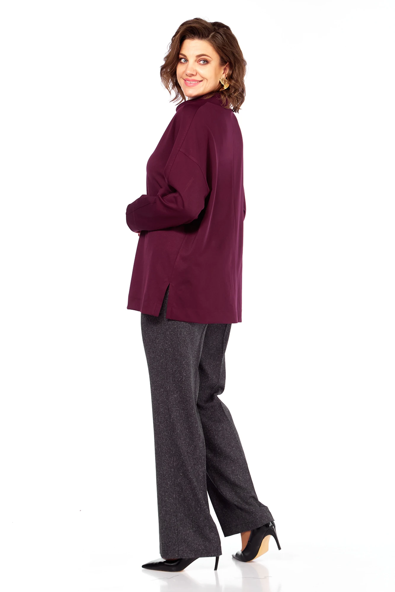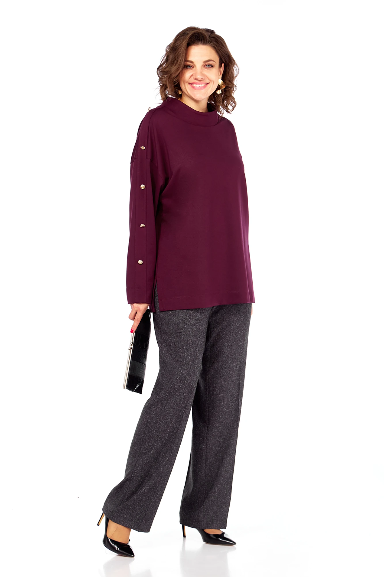 Комплект брючный двухпредметный, состоит из джемпера и брюк. Джемпер свободного силуэта выполнен из трикотажного полотна. Перед цельнокроенный, спинка со средним швом. Рукава спущенные, от низа рукава до горловины обработана вставка, декорированная с одной стороны пуговицами. Горловина с воротником-стойка. В боковых швах разрезы. Брюки выполнены из костюмной ткани, пояс притачной со вставками из эластичной тесьмы. Застежка на молнию и петлю с пуговицей. В передних деталях брюк обработаны карманы с подрезным бочком.
