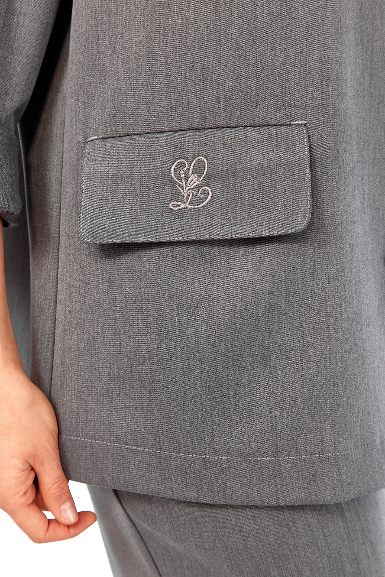 Костюм женский двухпредметный, состоит из жакета и брюк, выполнен из однотонной костюмной ткани. Жакет прямого силуэта со стояче-отложным воротником и центрально-бортовой застежкой на петли и пуговицы. По переду обработаны нагрудные вытачки и прорезные карманы с клапаном. Спинка на притачной кокетке. Рукава слегка спущенные. Брюки классической посадки, пояс притачной частично на эластичной тесьме. Застежка на петли и пуговицы. По передним деталям брюк обработаны карманы с листочкой. Костюм дополнен дизайнерской вышивкой.