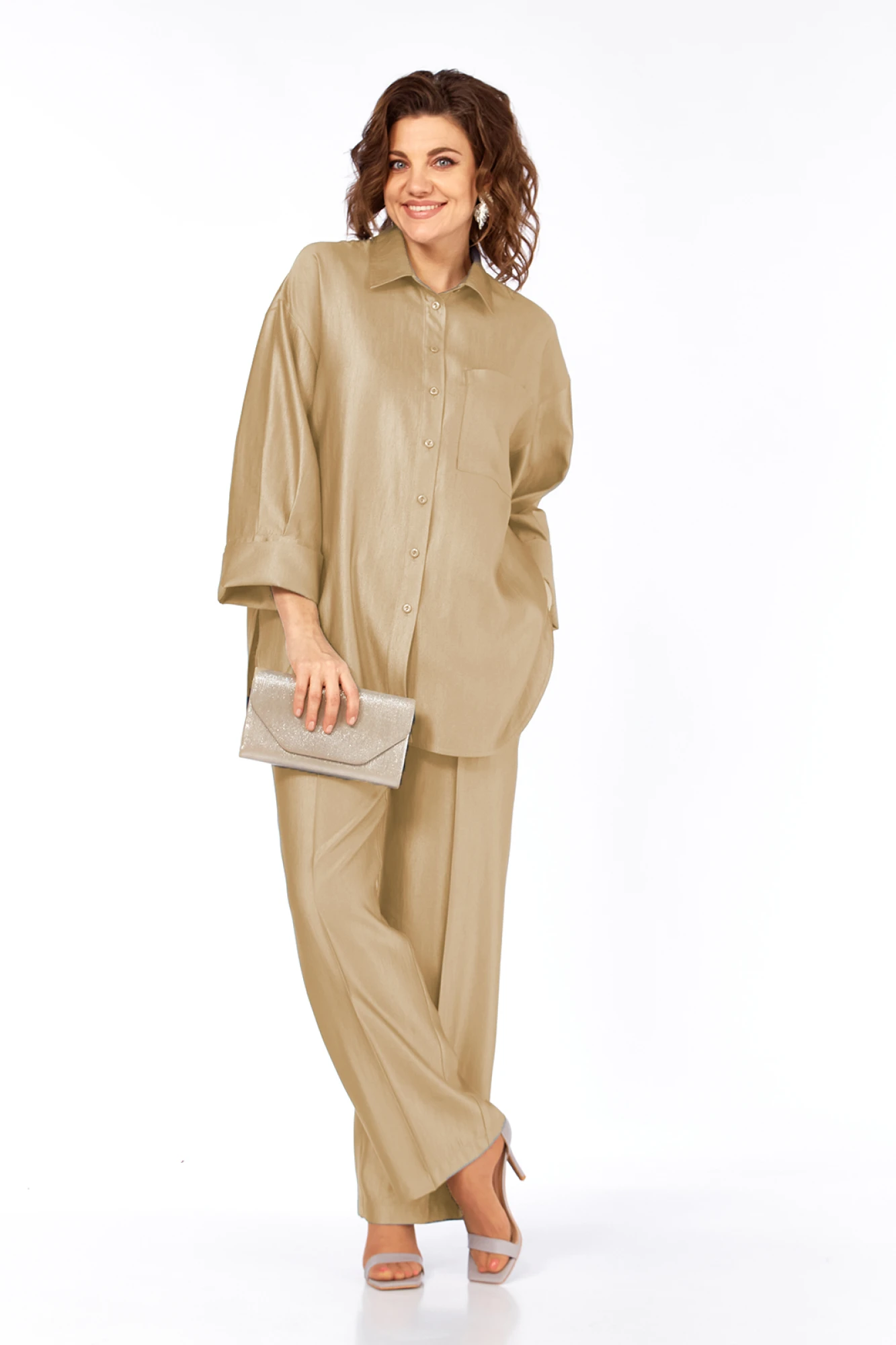 Костюм брючный двухпредметный, повседневно-нарядный, выполнен из ткани с мерцающим эффектом. Состоит из блузы и брюк. Блуза свободного силуэта. Воротник рубашечного типа, застежка центральная на петли и пуговицы. С левой стороны настрочной карман. Спинка с притачной кокеткой и встречной складкой. Рукава спущенные, по низу складки и широкая притачная манжета. Низ блузы фигурный. Брюки прямые, пояс притачной на резинке. В брюках обработаны карманы.