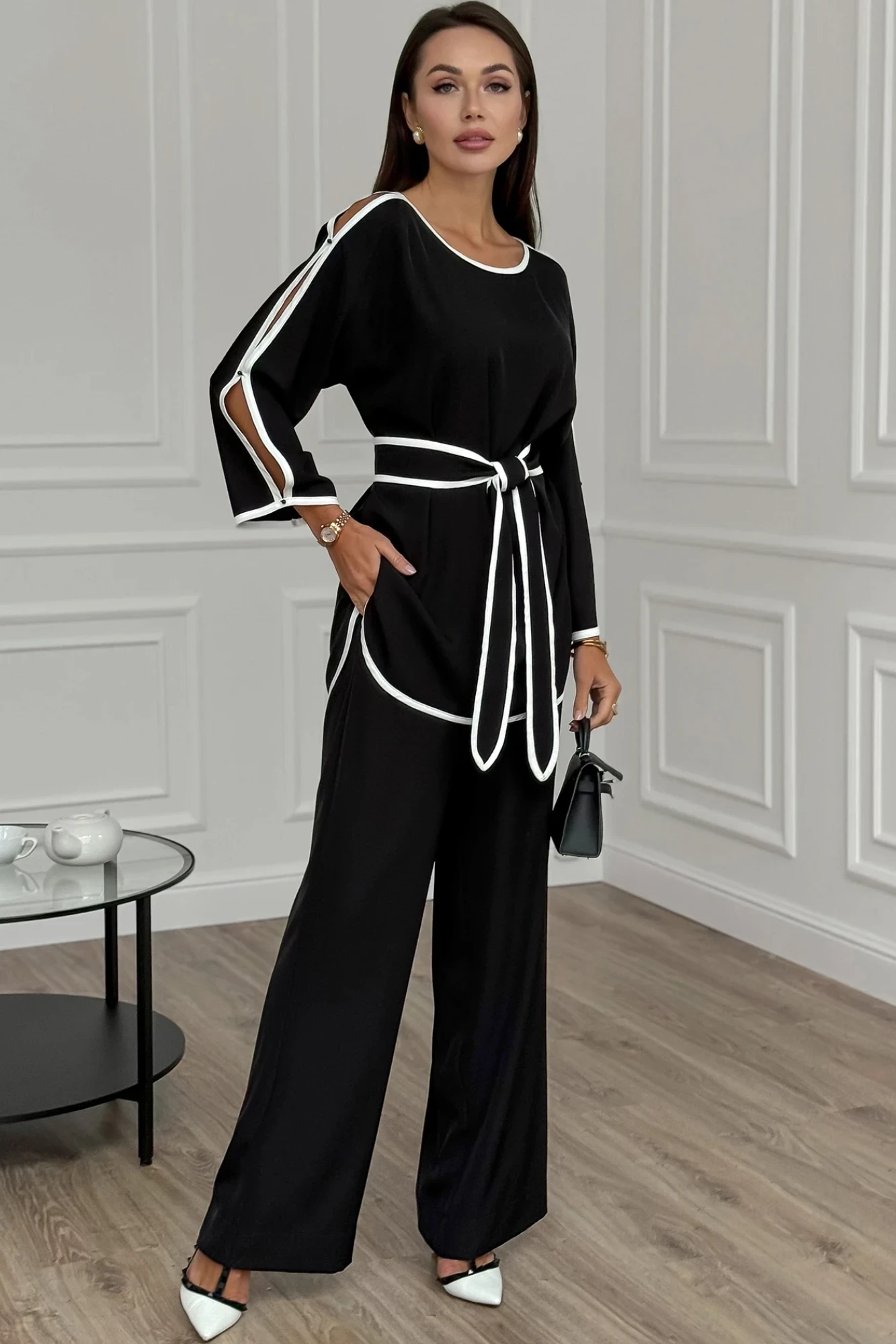 Костюм женский, состоящий из блузы и брюк. Блуза прямого силуэта с цельнокроеным рукавом. Перед и спинка по контуру окантованы тканью компаньоном контрастного цвета. Горловина округлой формы. Блуза комплектуется съемным поясом из основной ткани. Пояс обработан тканью компаньоном. Брюки женские, расширенные. По переду обработаны карманы с наклонным входом. На задних половинках брюк застрочены вытачки. Верх обработан широким притачным поясом с резинкой. Декоративные элементы и фурнитура могут отличаться от заявленных на фото. Цвет материала может отличаться по тону в зависимости от настроек вашего монитора!