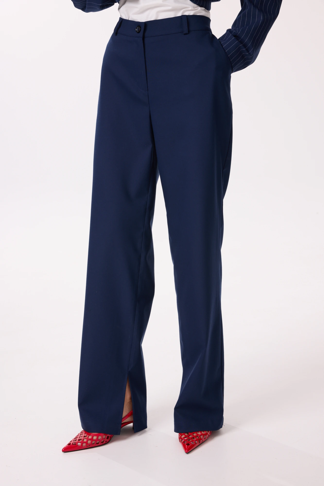 Костюм женский, состоящий из жакета на подкладке и брюк. Жакет прямой с центральной бортовой застежкой на петлю и пуговицу. Правая и левая часть переда асимметричны. Правая верхняя часть переда с отлетной асимметричной кокеткой выполнена из основной ткани . Нижняя часть выполнена из ткани-компаньона. Левая часть переда выполнена из основной ткани, прорезной карман с клапаном (декорирован металлическим украшением) и листочкой выполнен из ткани-компаньона. Спинка цельнокроеная. Плечо слегка спущено. Рукав длинный двухшовный. По горловине воротник пиджачного типа. Брюки прямые, выполнены из ткани-компаньона. По переду обработаны карманы с наклонным входом с листочкой, застежка на молнию. По задним половинкам застрочены вытачки. По шаговым срезам брюк расположены разрезы. Верх обработан притачным поясом(частично на резинке), застегивающимся на петлю и пуговицу. Декоративные элементы и фурнитура могут отличаться от заявленных на фото. Цвет материала может отличаться по тону в зависимости от настроек вашего монитора!