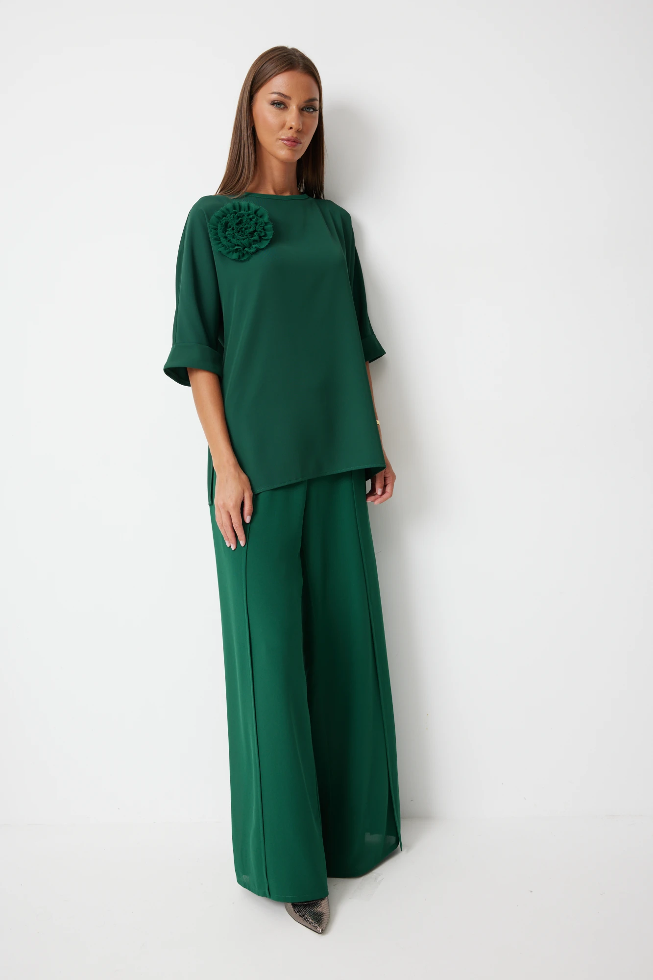 Костюм состоит из блузы и брюк. Блуза женская прямого силуэта закрывающая линию паха с цельнокроеными рукавами. К блузке прилагается съёмный декор – цветок. По боковым швам располагаются разрезы. Спинка с центральным швом и застежкой на навесную петлю и пуговицу. Горловина обработана косой бейкой. Рукав до локтя, низ рукава обработан отрезной отворачивающейся манжетой, закрепленной по швам. Низ блузки обработан швом «в подгибку». Брюки прямого силуэта, выполнены из шифоновой ткани на подкладке полной длинны. Боковой шов брюк открыт. Синка брюк заходит на перед по верхней части. Подкладка из не просвещающейся креповой ткани. Верх брюк обработан отрезным поясом. Центральная часть пояса без резинки, остальной пояс на резинке. Низ брюк обработан швом « в подгибку». Цвет материала может отличаться по тону в зависимости от настроек вашего монитора!.