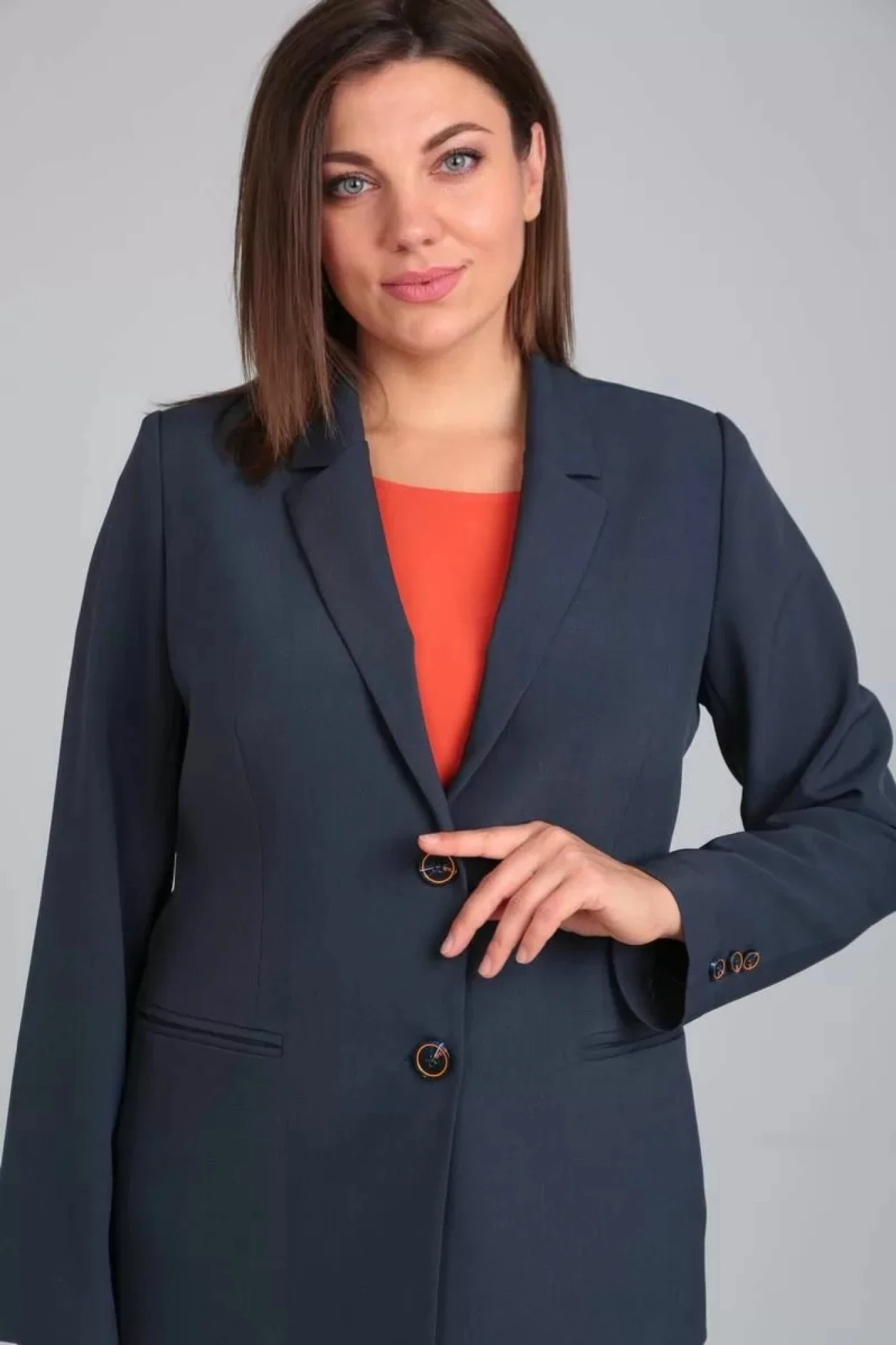 Костюм тройка , состоящий из жакета , топа и брюк . Жакет однобортный на подкладке с застежкой на петли пуговицы . Рукав втачной двухшовный . По переду обработаны прорезные карманы в рамку. Брюки прямые на притачном поясе с застежкой на молнию и крючок , и карманами в боковых швах . Топ со спущенной линией плеча и боковыми вытачками.