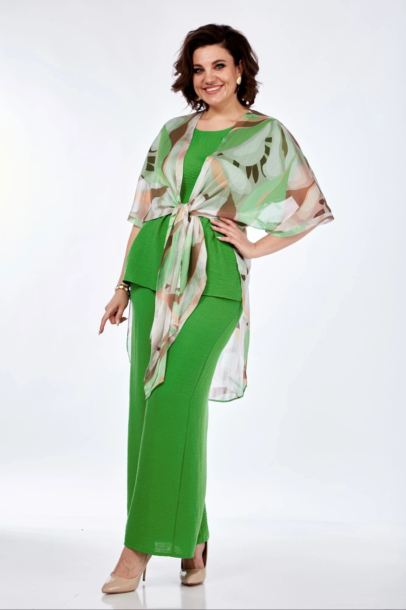 Комплект тройка: шазюбль, топ и брюки. Шазюбль из шифона, со спущенным плечом без застежки. По бокам разрезы. Топ с округлым вырезом горловины и спущенным плечом. Брюки свободного кроя, с карманами в боковых швах, пояс на резинке. Длина шазюбля 112 см, длина топа 57 см, длина брюк 102 см