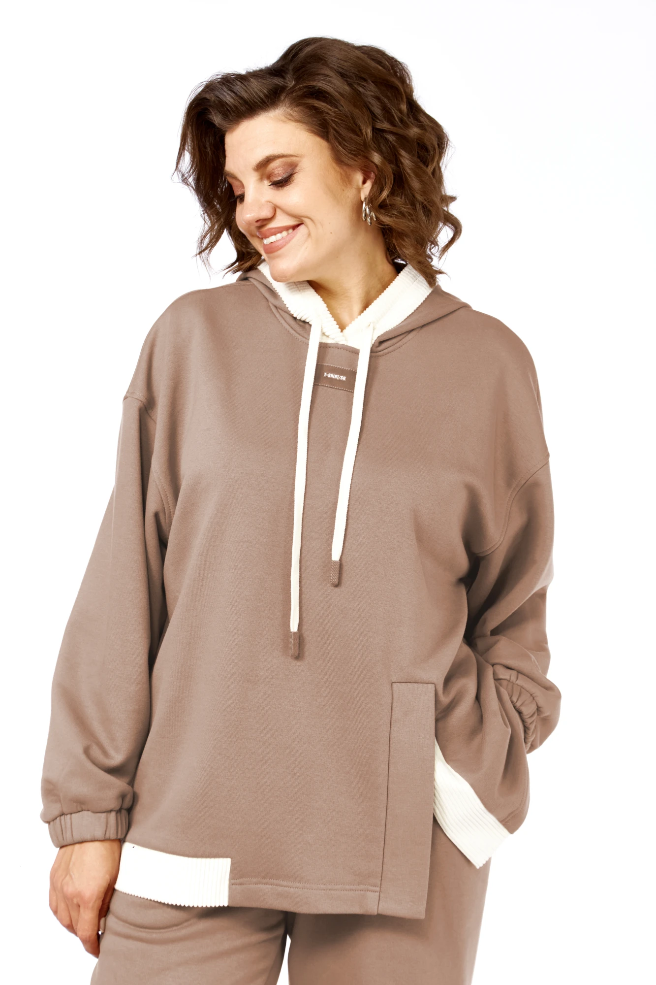 Байка прямого силуэта, с капюшоном. Линия плеча спущена. Капюшон отделан бейкой из вельвета молочного цвета, декоративные шнуры, нашивка. По низу байки так же отделка и декоративная шлица. Низ рукава на резинке. Спинка прямая со средним швом без особенностей.