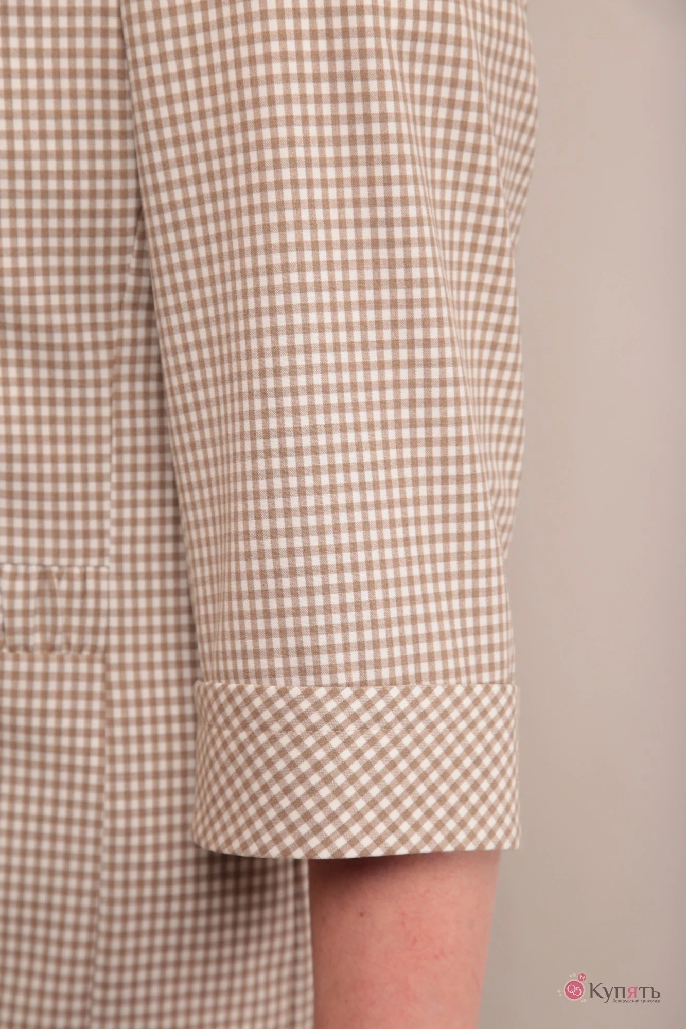 Костюм женский полуприлегающего силуэта состоит из жакета, топа и брюк. Жакет полуприлегающего силуэта без подкладки с застежкой на три петли и пуговицы. По переду рельефы выходящие из проймы и декоративный элемент в виде листочки. Рукав втачной двухшовный с притачной манжетой по низу. Брюки полуприлегающего силуэта, слегка зауженные к низу, на поясе и застежкой на тесьму-молнию и крючок. Топ прямого силуэта со спущенной линией плеча. По переду нагрудные вытачки.