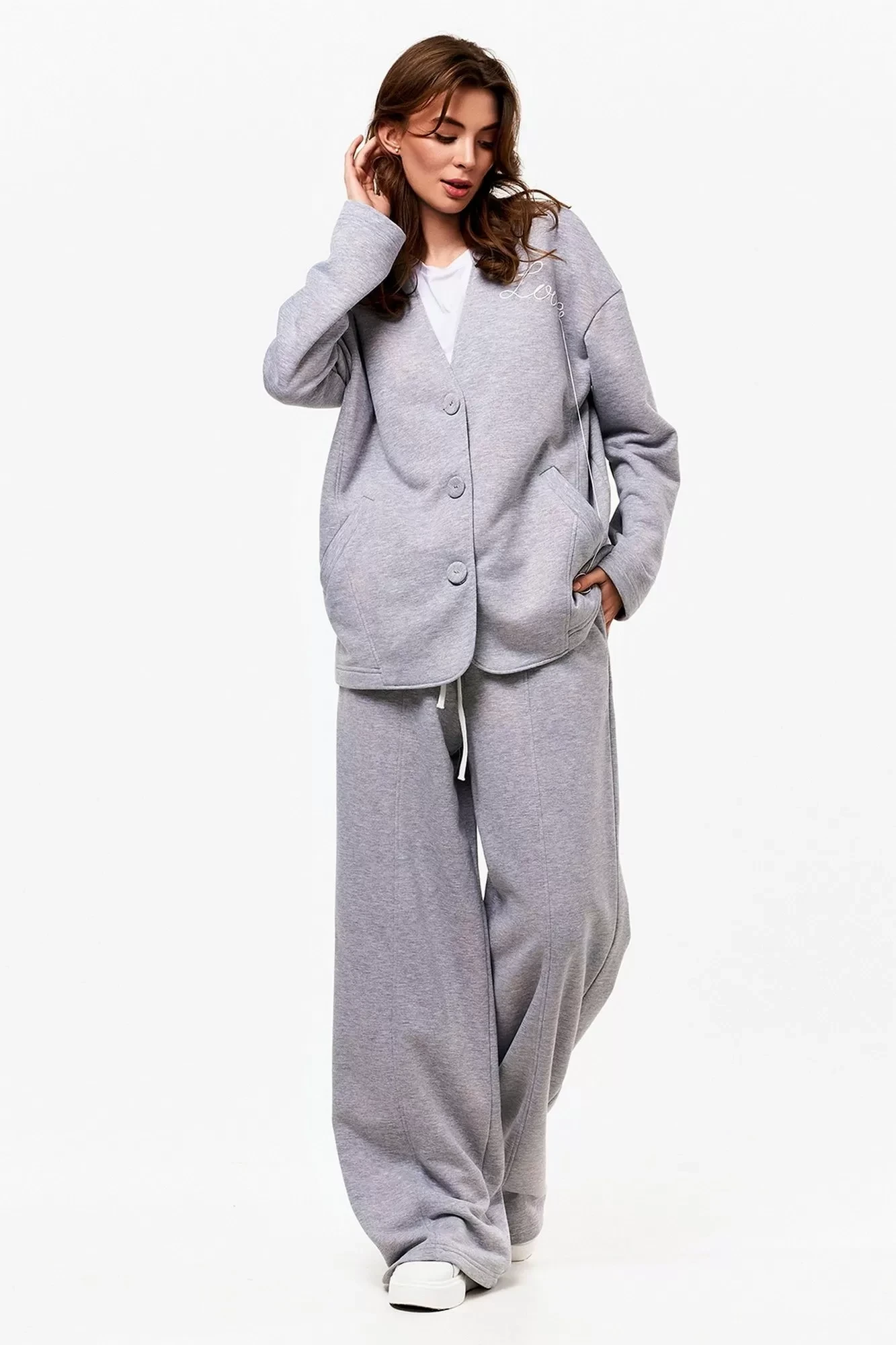 Кардиган из футера 3-х нитки с контрастной вышивкой шнуром. Застёжка на пуговицы. Брюки из футера 3-х нитки прямые от бедра. На резинке по талии и с контрастным шнуром. По переду отстроченные защипы.