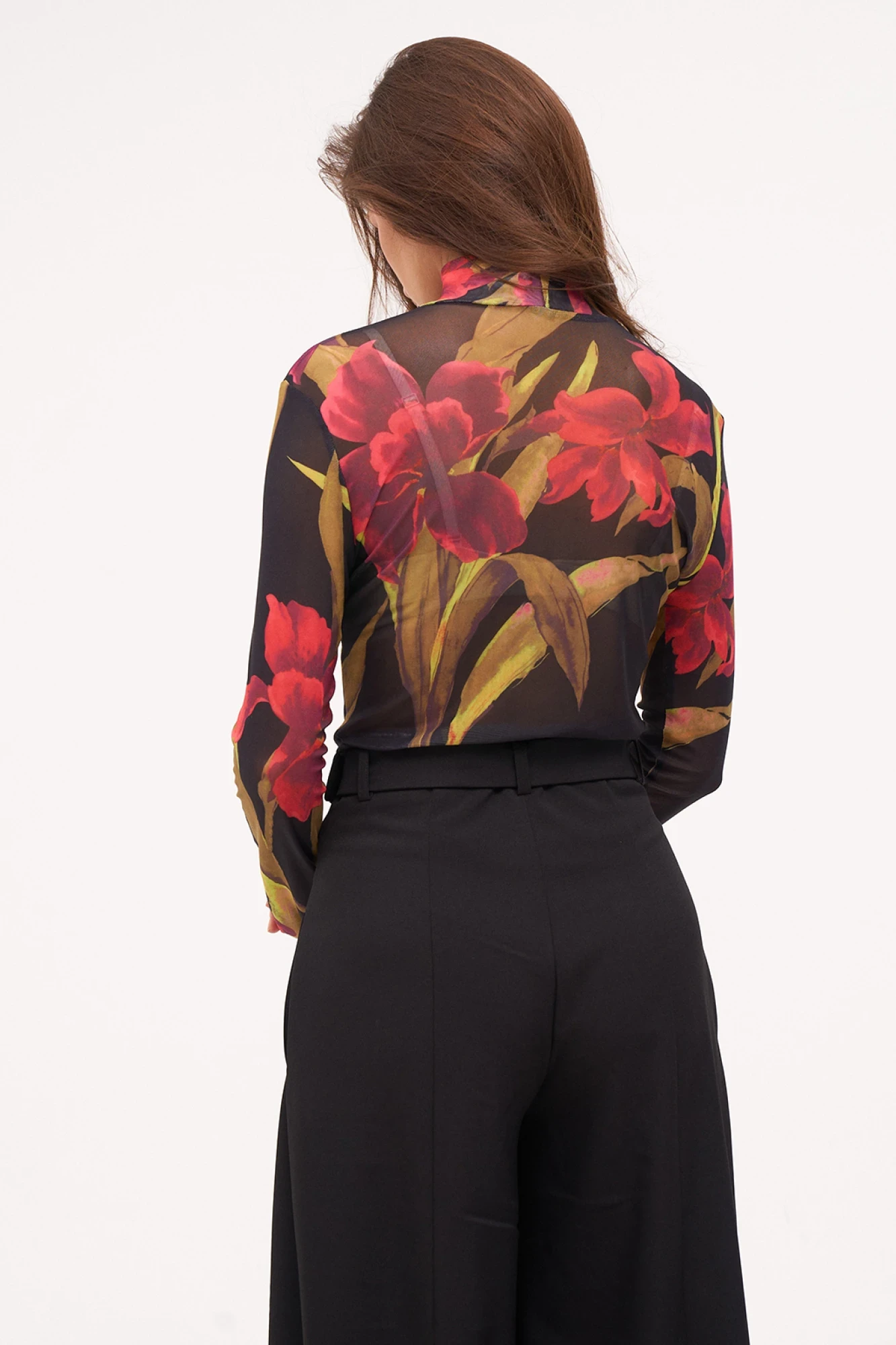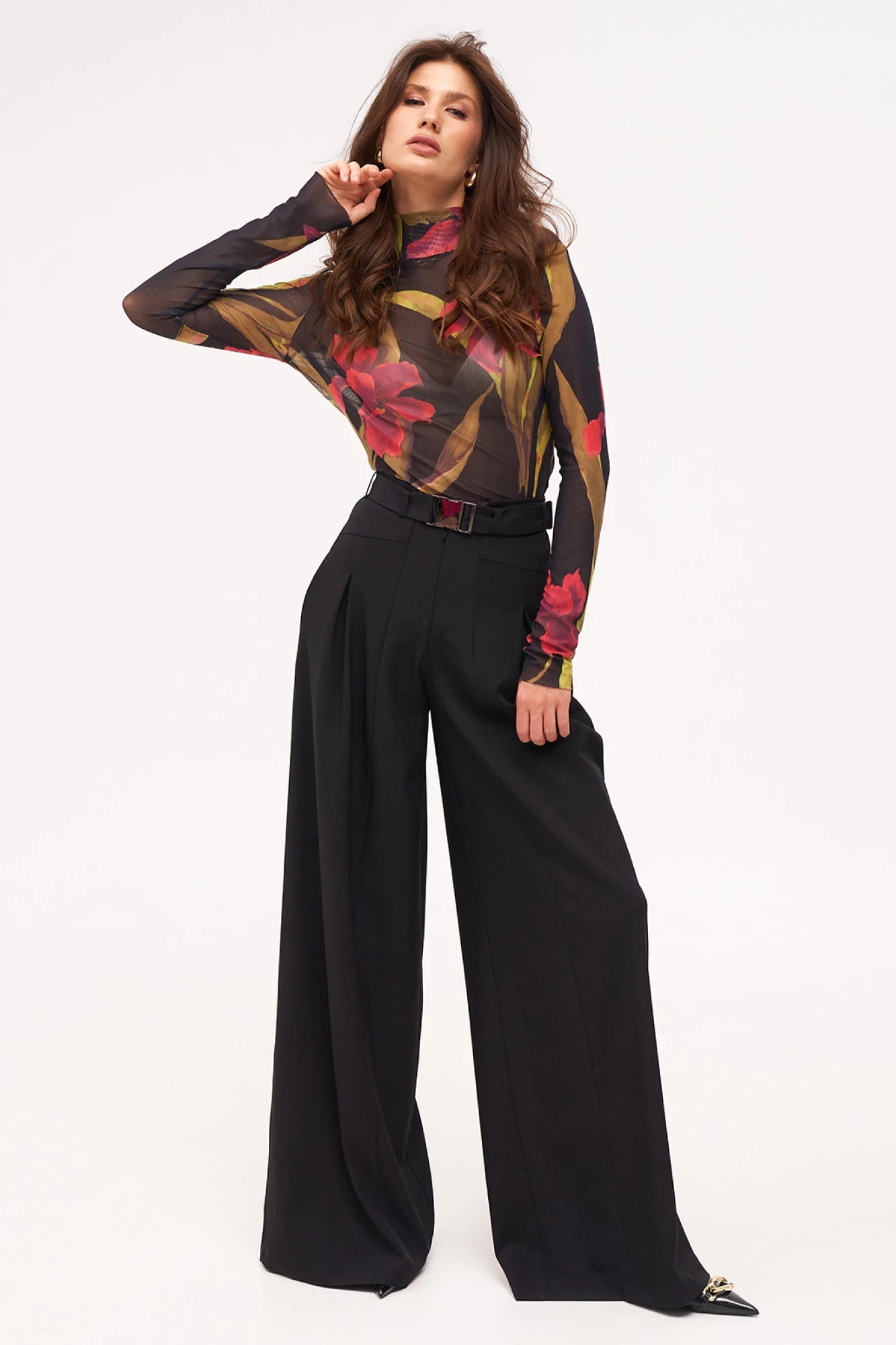 Комплект из двух предметов: джемпер и брюки. Джемпер облегающий из эластичной, прозрачной сетки в яркий принт. Брюки-палаццо с высокой посадкой по талии. Верх брюк фигурный. По переду вертикальные рельефы по центру и складки. В боковых швах карманы. Застёжка на потайную молнию спереди. Комплектуется текстильным ремнём с металлической пряжкой.