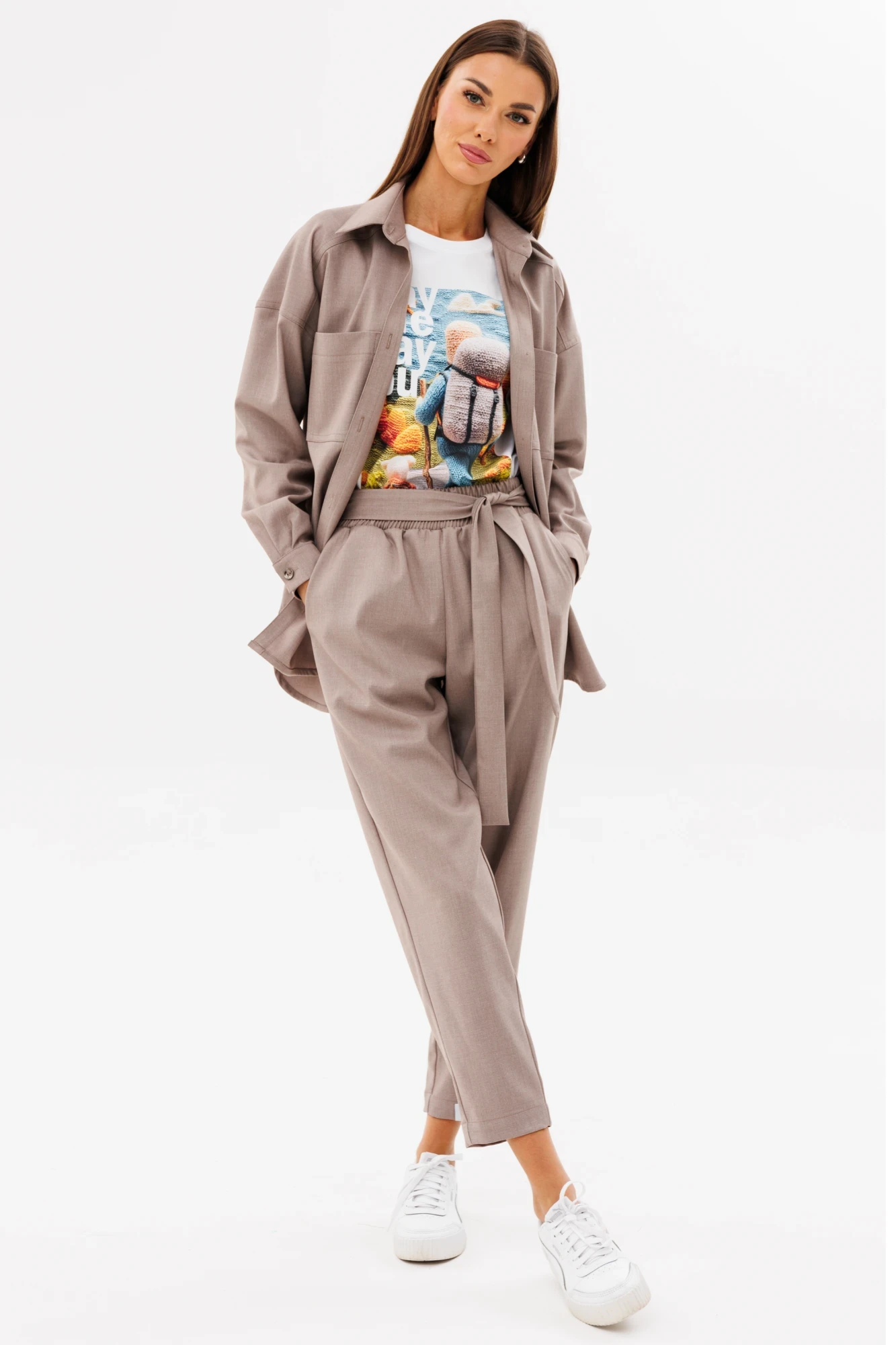 Представляем костюм состоящий из блузы и брюк. Блуза свободного кроя, которая идеально сочетает в себе элегантность и комфорт. Брюки свободного кроя “Urban Elegance” – идеальное сочетание офисной строгости и свободного спортивного стиля. Этот костюм изготовлен из высококачественной костюмной ткани, что обеспечивает ему долговечность и элегантный внешний вид.