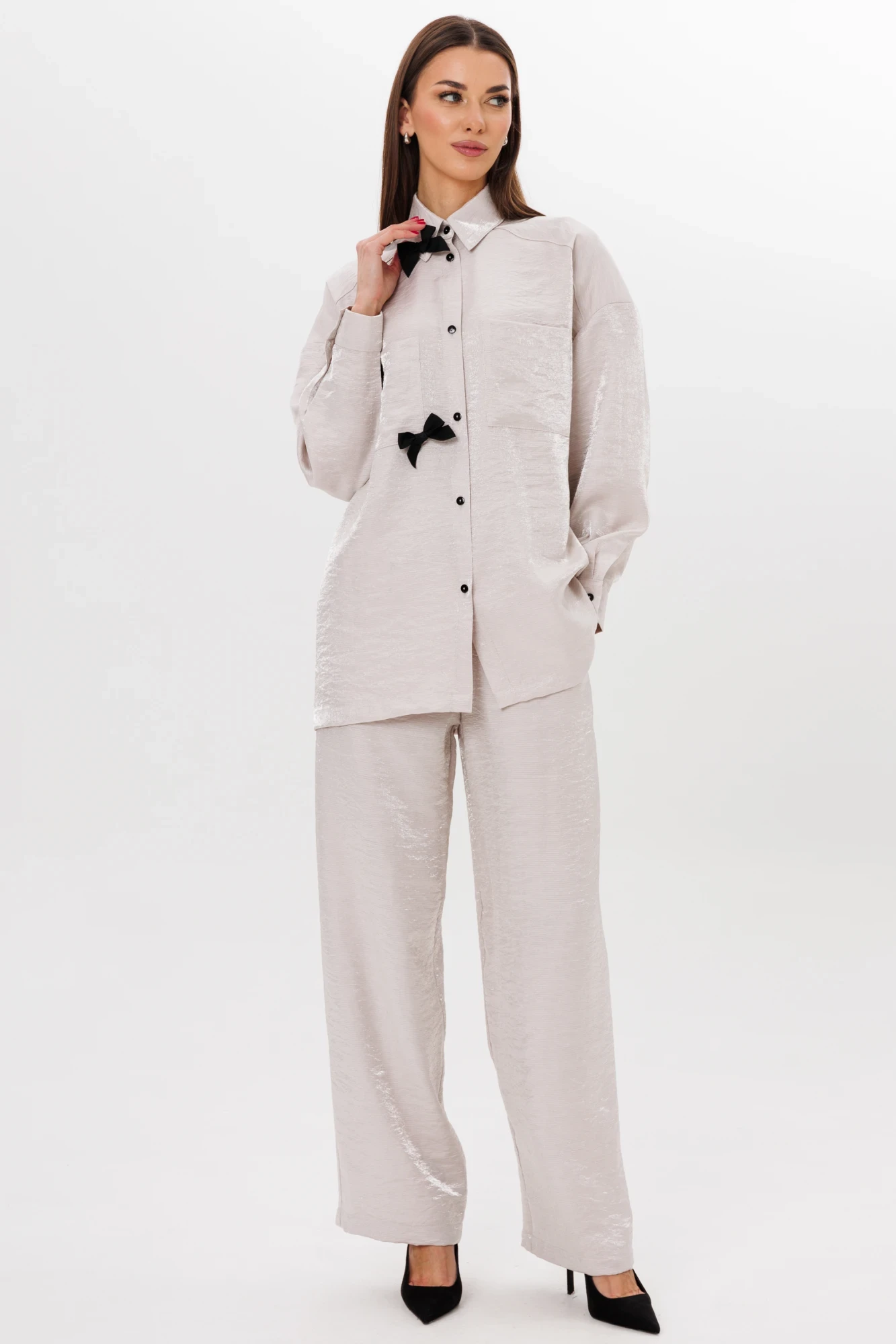 Этот костюм из блестящей пудровой ткани, состоящий из блузы и брюк, представляет собой гармоничное сочетание элегантности и современного стиля. Блуза украшена двумя нагрудными карманами, контрастными черными пуговицами и изысканными декоративными бантами, добавляющими утонченность и женственность. Прямые брюки свободного силуэта с карманами в боковых швах обеспечивают комфорт и создают элегантный образ. Этот костюм идеально подходит для создания стильного и эффектного наряда, подчеркивая вашу индивидуальность и безупречный вкус.