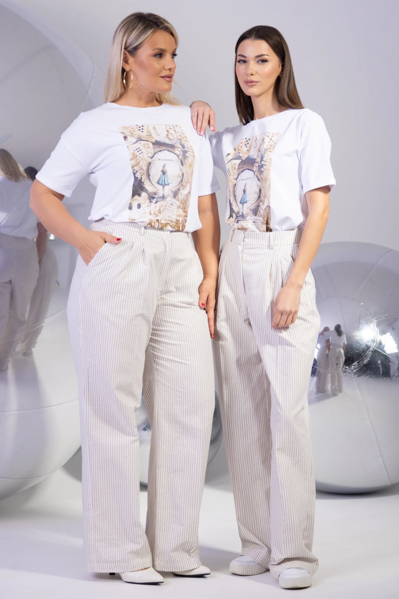 Брюки-палаццо свободного силуэта создают эффект легкости и динамики. Модель с резинкой по спинке пояса (от 48 размера) гарантирует максимальный комфорт и удобную посадку, а вертикальная полоска визуально удлиняет силуэт. Хлопковая ткань с добавлением эластана обеспечивает свободу движений и сохраняет форму даже при активной носке.