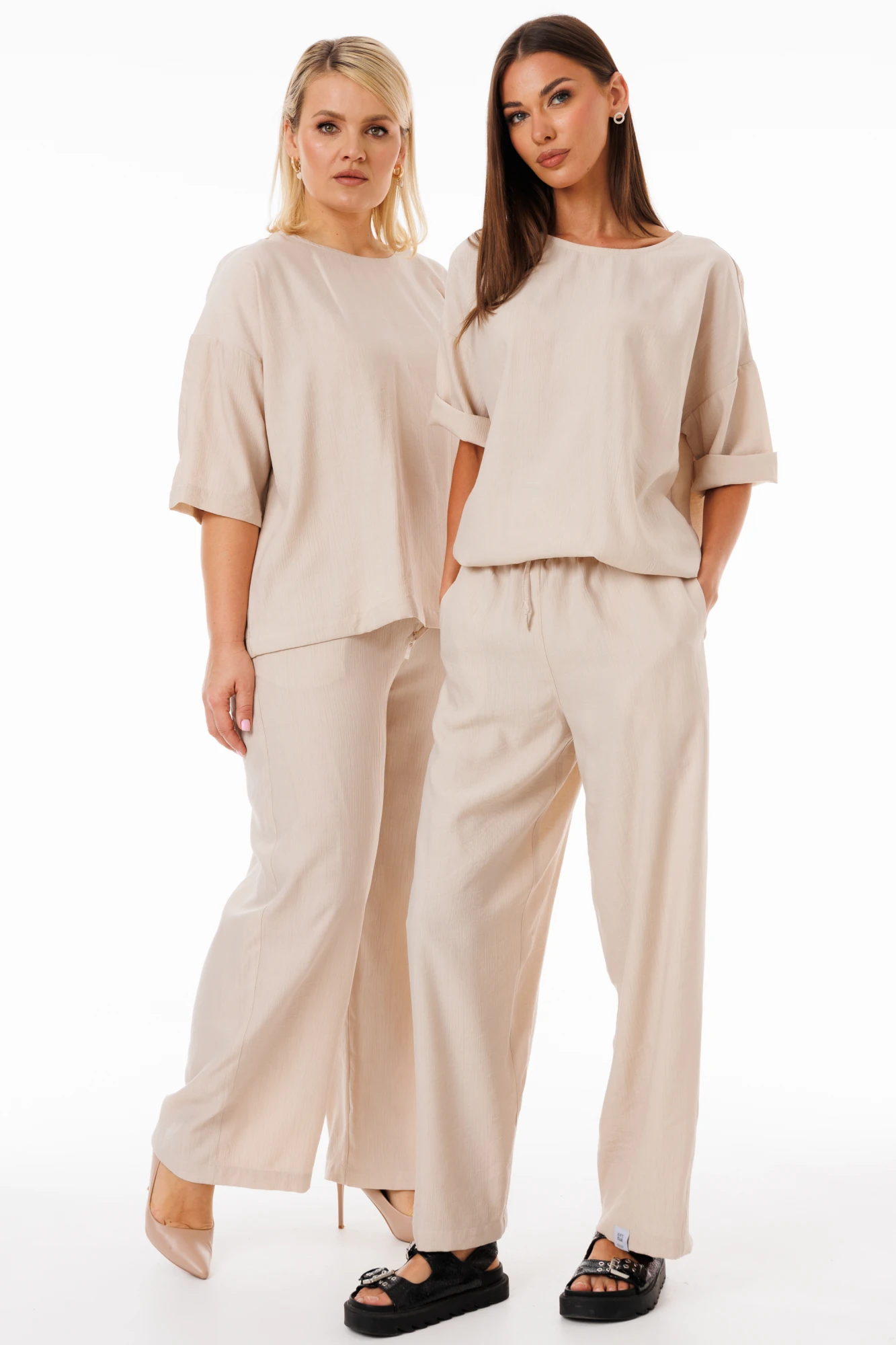 Уникальный комплект сочетает современный дизайн и функциональность. Джемпер свободного кроя выполнен из мягкой жатой вискозной ткани, которая обеспечивает комфорт и легкость в движении. Модель дополнена приспущенными рукавами, создающими расслабленный силуэт, и практичной кулиской по низу изделия. Регулируемая ширина низа позволяет подчеркнуть индивидуальный стиль — затяните шнур для спортивного лоска или оставьте свободным для ультрамодного oversize-эффекта.