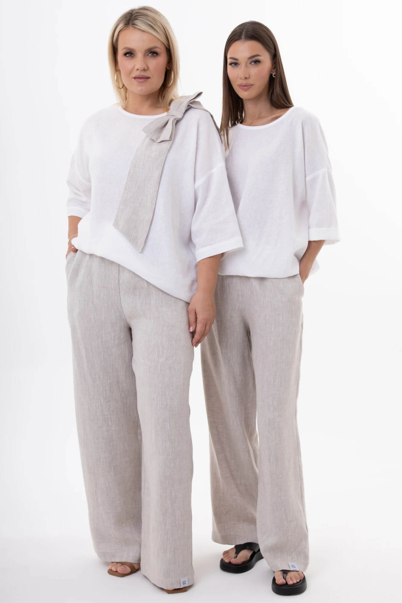 Костюм из белорусского льна с вискозой премиум-класса — идеальное сочетание лаконичного стиля, комфорта и функциональности. Набор включает джемпер свободного прямого кроя со съемным декоративным бантом и брюки на эластичной резинке с боковыми карманами. Натуральные материалы обеспечивают воздухопроницаемость, гипоаллергенность и устойчивость к деформации.