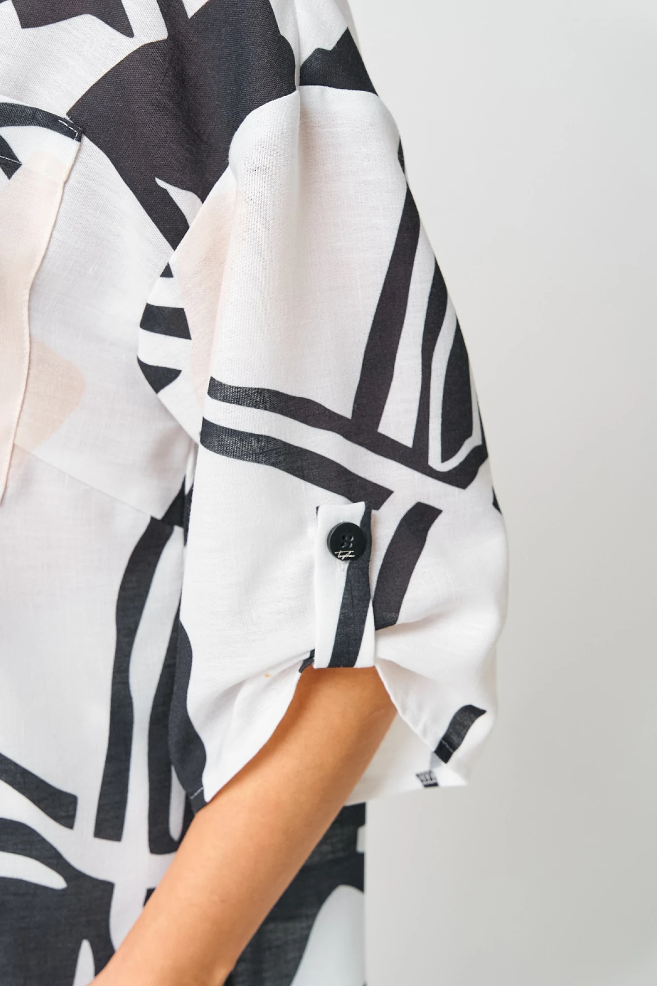 Элегантный женский комплект, состоящий из удлиненного льняного блузона с современным принтом и однотонных брюк из ткани с добавлением вискозы. Блузон свободного облегания, с центральной застежкой на пуговицы, воротником рубашечного типа, накладными карманами по переду, высокими разрезами в боковых швах, рукав 3/4 с патой на пуговицу. Брюки длинные, прямые, с карманами в боковых швах и отрезным поясом с резинкой.