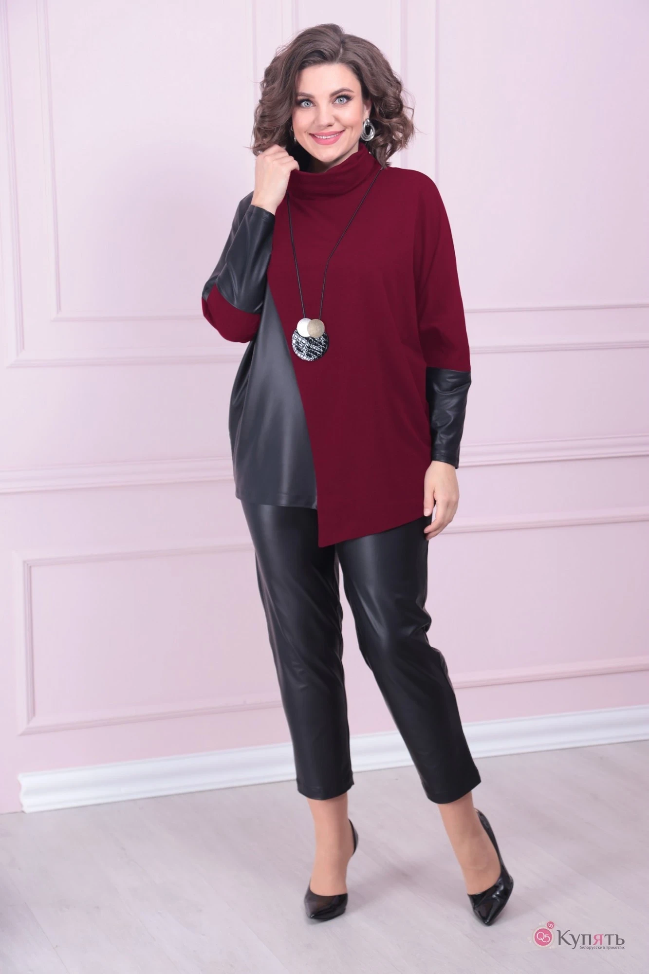 Туника - трикотаж - вискоза 65%, полиэстер 32%, эластан 2%; экокожа - подиэстер 100%. Брюки - экокожа - полиэстер 100%