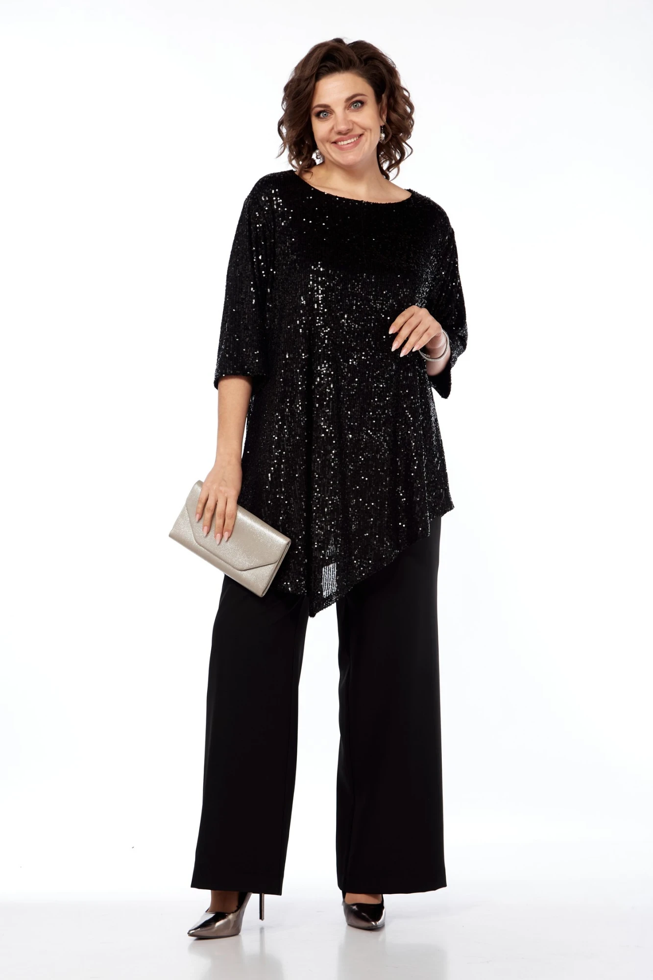 Туника выполнена из ткани в пайетки, свободного силуэта, вырез горловины округлый. Рукав втачной одношовный, длиной 3/4. Низ туники по полочке и по спинке с двумя асимметричными углами. Спинка цельная, без среднего шва. Туника и рукава туники на подкладке.