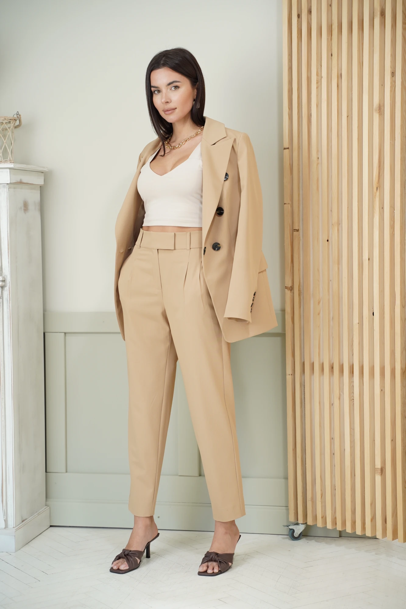 Комплект женский 2-ух предметный (жакет, брюки) Жакет прямого силуэта, на подкладке. Застёжка двубортная на 2 пуговицы (4 пуговицы декоративные). Борт с фигурным лацканом, воротник пиджачный. По переду прорезные карманы с клапаном и двумя обтачками. Рукав втачной, двухшовный, по низу рукава отлетная шлица с петлями-пуговицами. Спинка со средним швом и отлетной шлицей по низу. Брюки зауженные к низу, по переду складки и карманы в подрезе. Пояс брюк шириной 6 см, застёгивается на потайные пуговицы. Внутренний срез пояса обработан окантовкой. Длина жакета 76 см. Длина рукава 63 см. Длина брюк 97 см.ВНИМАНИЕ! Фурнитура может отличаться от фото