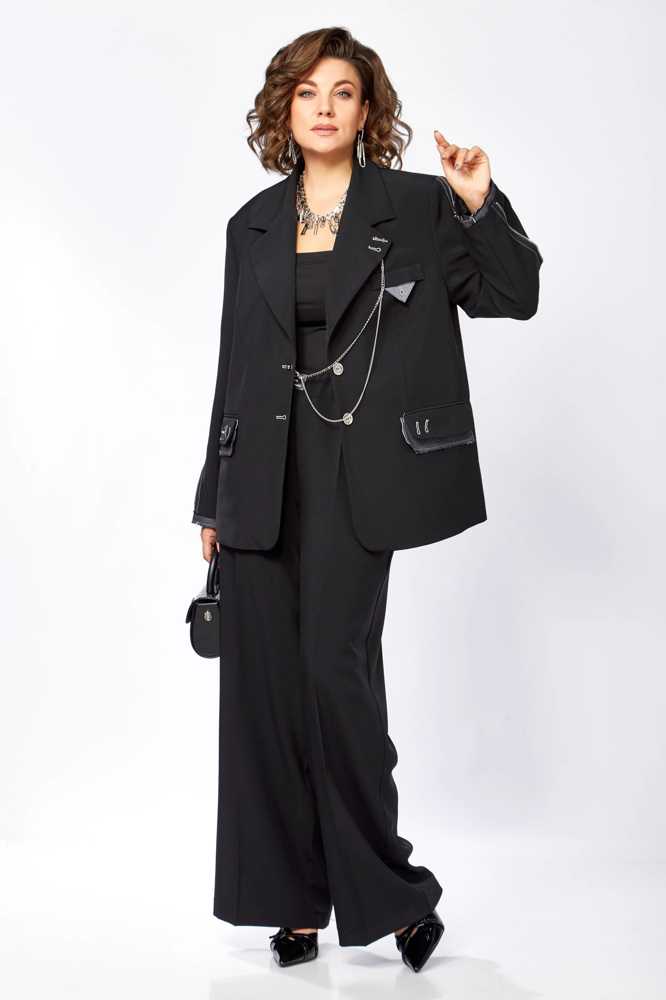 Брючный костюм в современном, слегка дерзком стиле. Удлиненный однобортный Жакет свободного классического кроя на подкладке ,с подвесными декоративными элементами-металическими цепочками , молниями на рукавах ,карманами с двойным клапоном , нагрудной листочкой , а отделка из множество контрастных глазковых петель ,креативное решение для мульти использования сьемного декора. Жакет придает образу строгий, но в то же время модный характер. Брюки свободного силуэта ,средней посадки, с боковыми карманами ,на эластичном поясе, что обеспечивает максимальную комфортной носки в течении всего дня . В целом костюм сочетает в себе элементы уличного и делового стиля без использования строгого дресс-кода, наш костюм -идеальная база для создания образа стильной, уверенной и немного роковой женщины ."