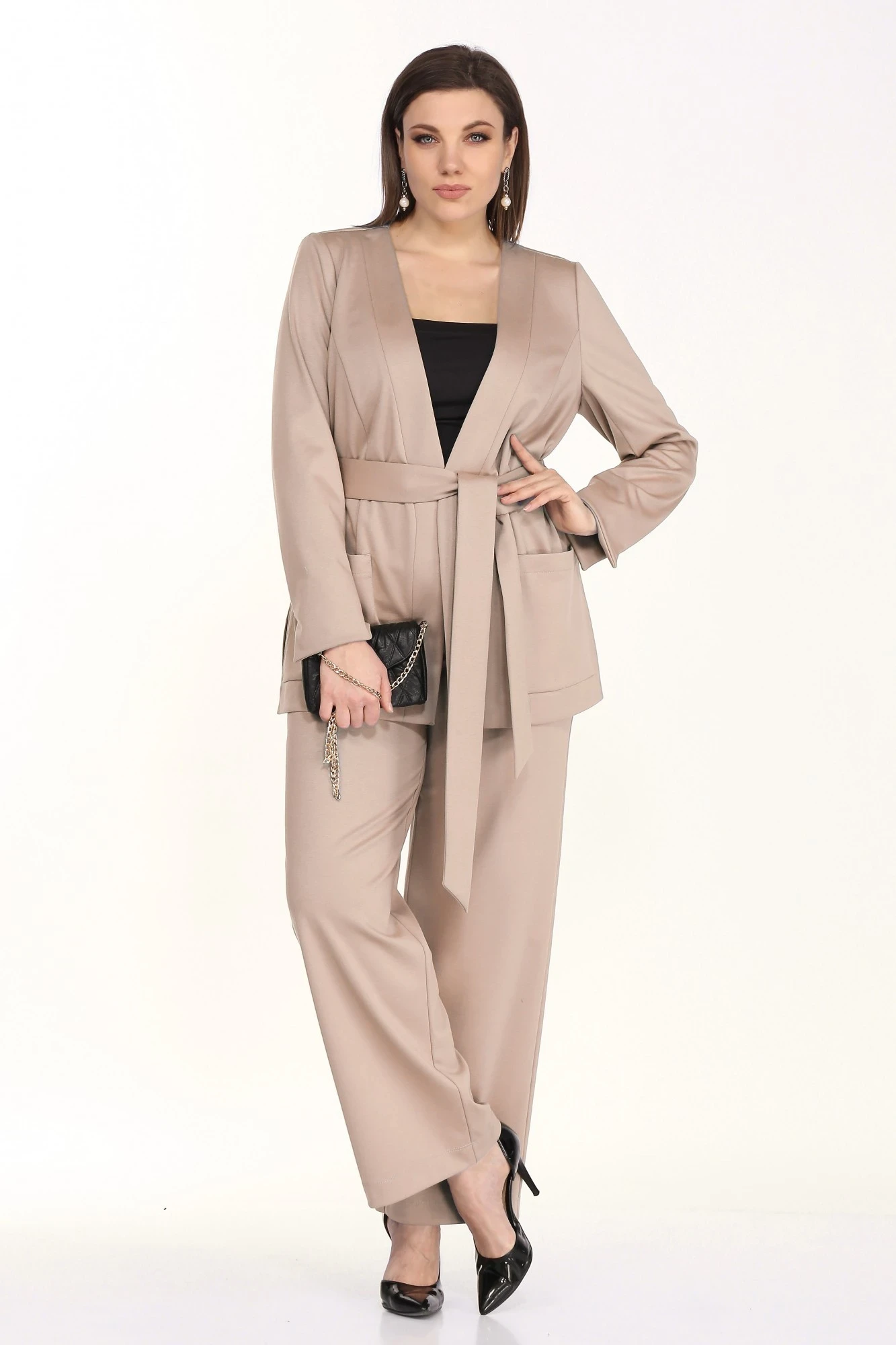 Брючный костюм из трикотажной ткани. Жакет прямого силуэта под пояс, с накладными карманами. Край борта притачная планка. Застежка встык на петлю и потайную пуговицу. Жакет без подкладки. Рукав втачной.