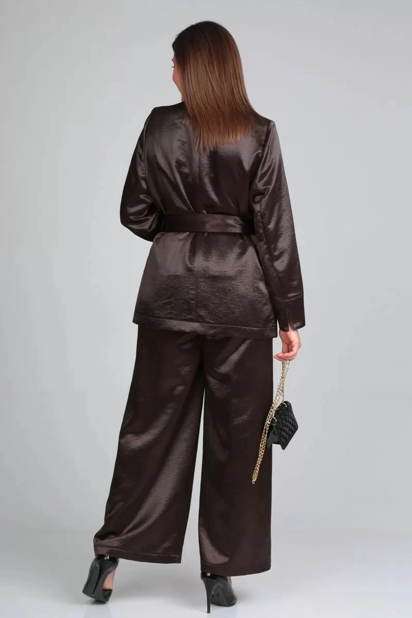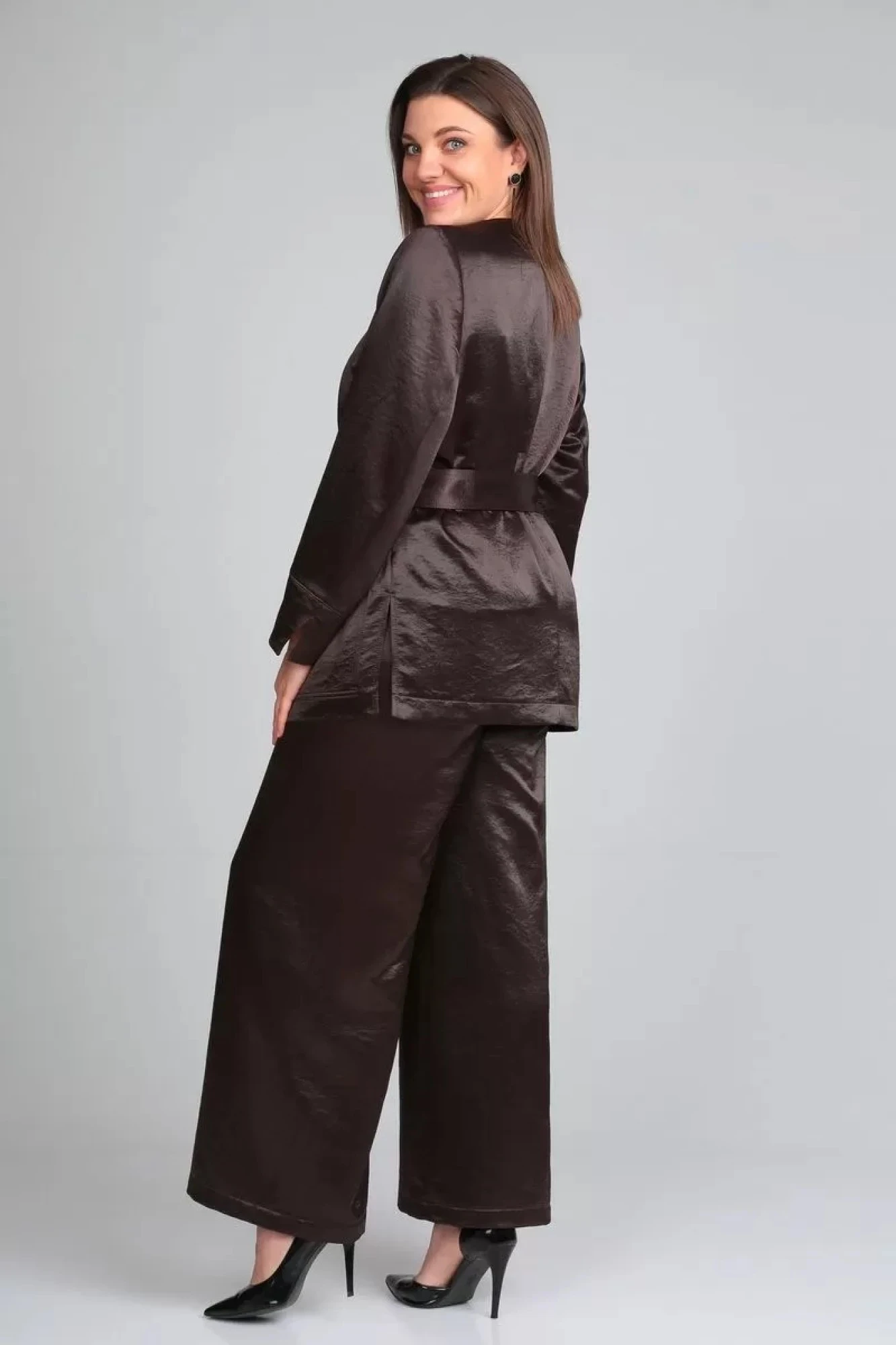 Брючный костюм из атласной ткани с легким эффуктом крэш. Жакет прямого силуэта под пояс, с накладными карманами. Край борта притачная планка. Застежка встык на петлю и потайную пуговицу. Жакет без подкладки. Рукав втачной.