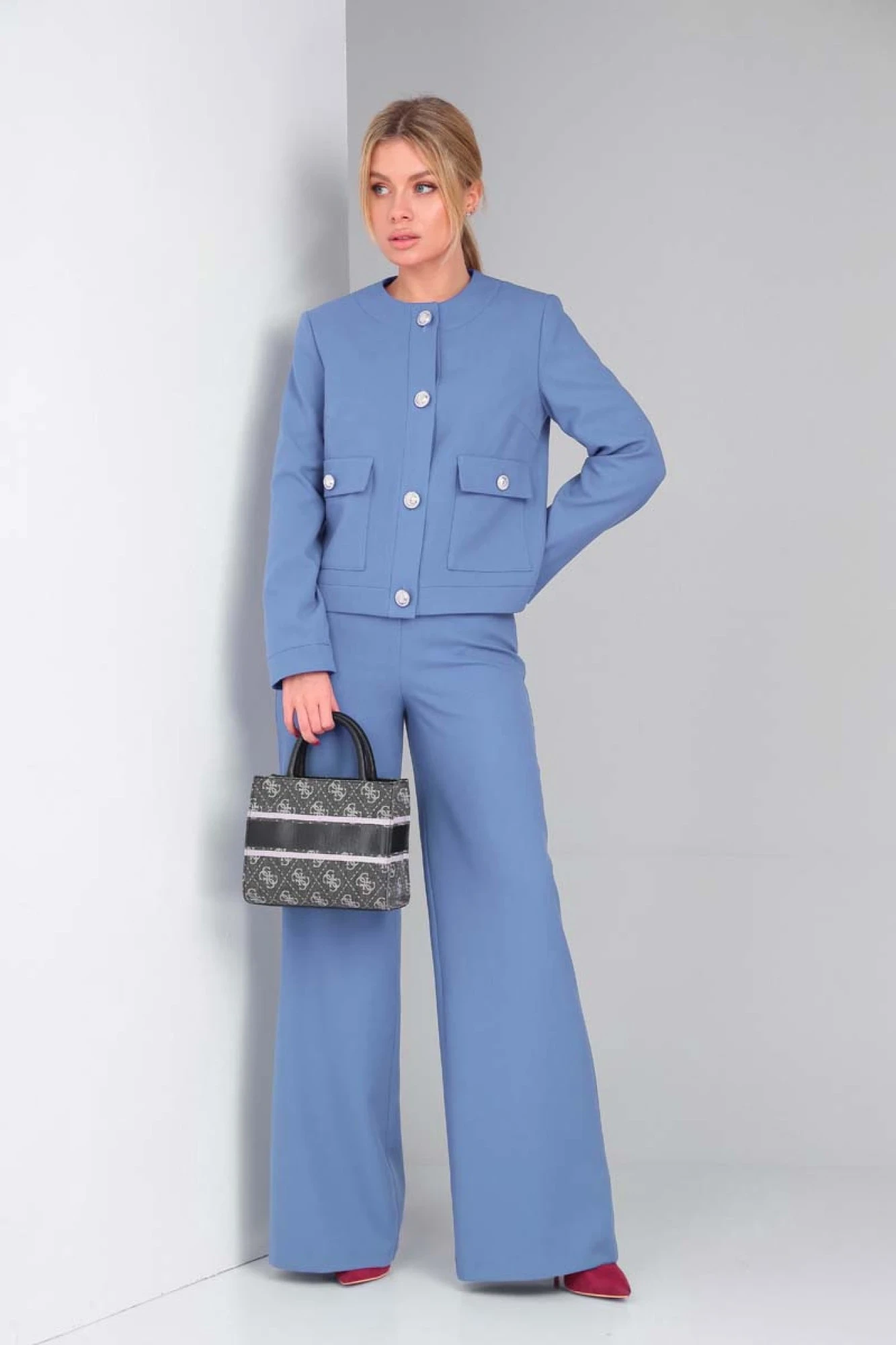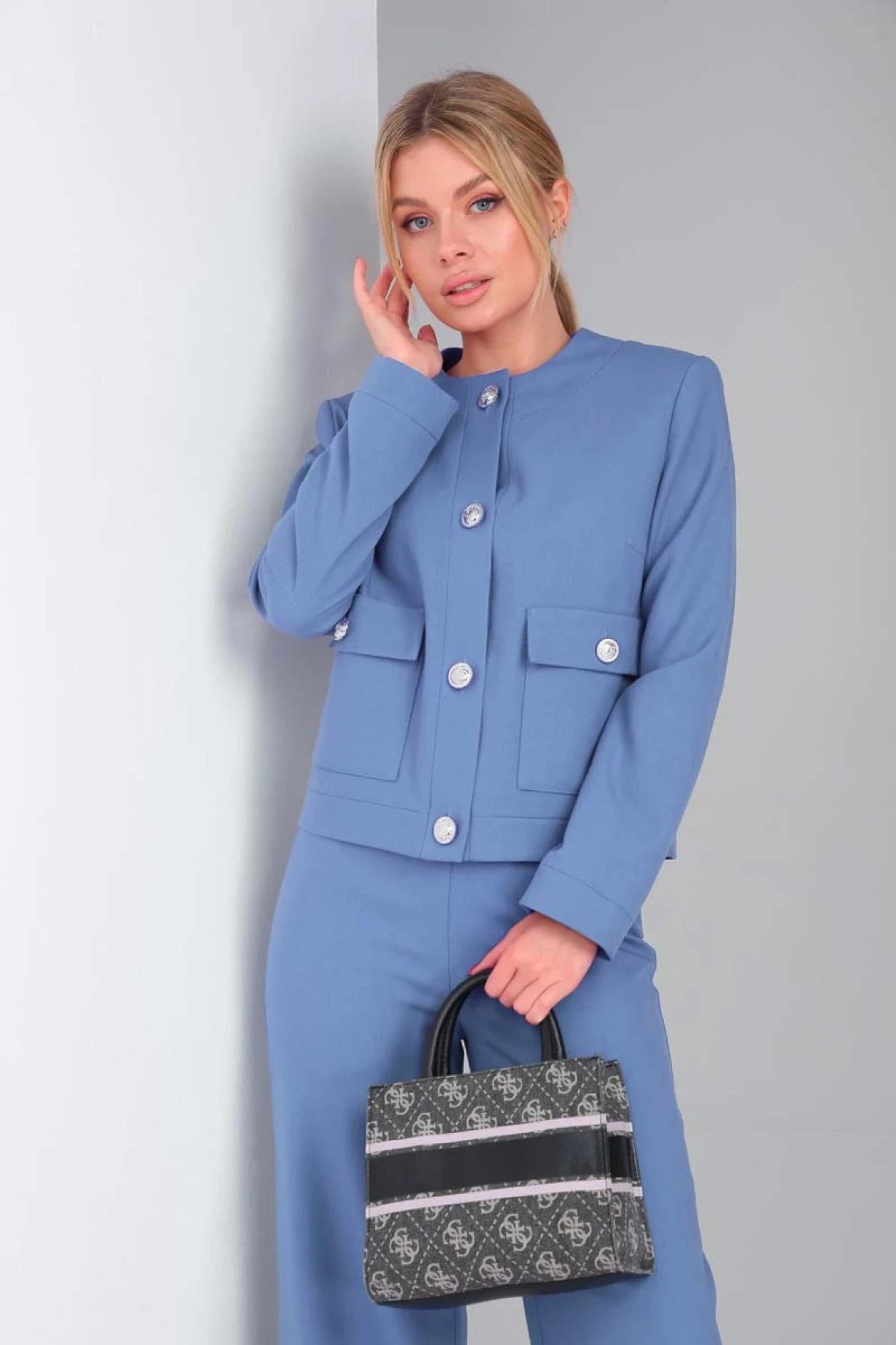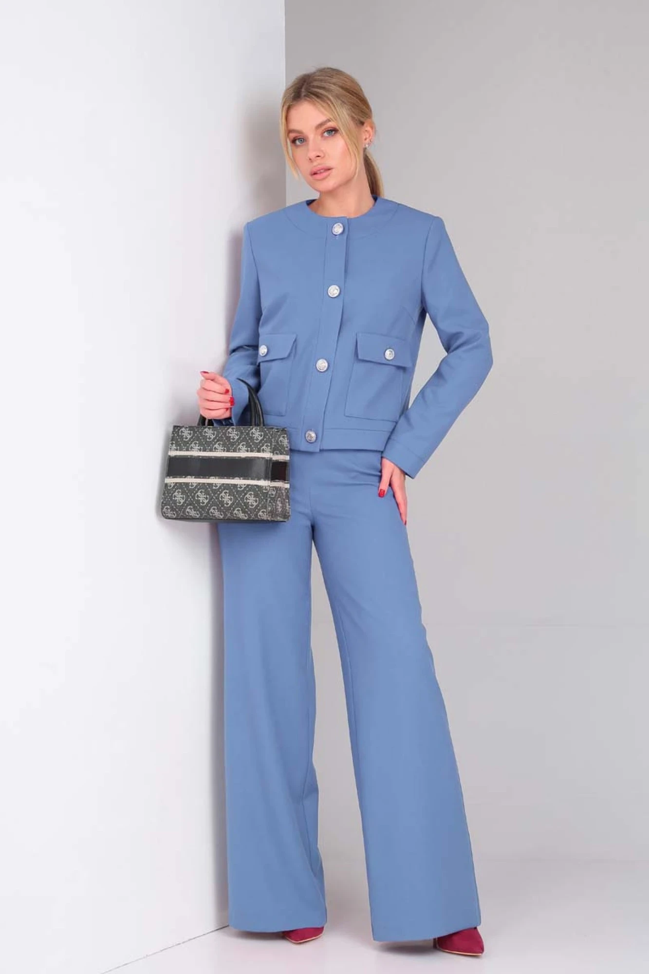 Стильный летний костюм в стиле "ШАНЕЛЬ", выполнен из костюмной ткани. Жакет с длинным рукавом и манжетой. По полочкам накладные карманы, застежка на петли,пуговицы. Брюки высокой посадки на молнии в среднем шве передней половинки, без пояса, расширены от бедра.