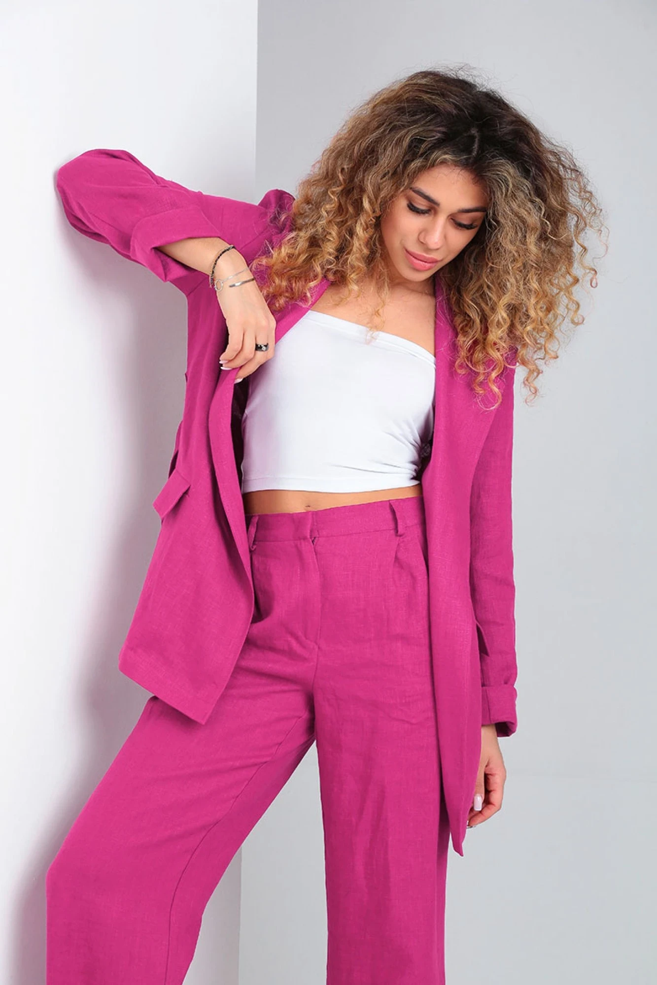 Брючный костюм из умягченного льна без подкладки. Жакет двубортный под пояс без застежки. Рукав втачной с оворотом, по полочкам прорезные карманы с клапаном и обтачкой. Пояс в комплекте.Брюки свободного силуэта Палаццо с карманами в боковых швах, застежка молния. Длина жакета 78 см, рукав 56 см. Длина брюк 108 см. Длина жакета 56 см, брюки по боковому шву 108 см.