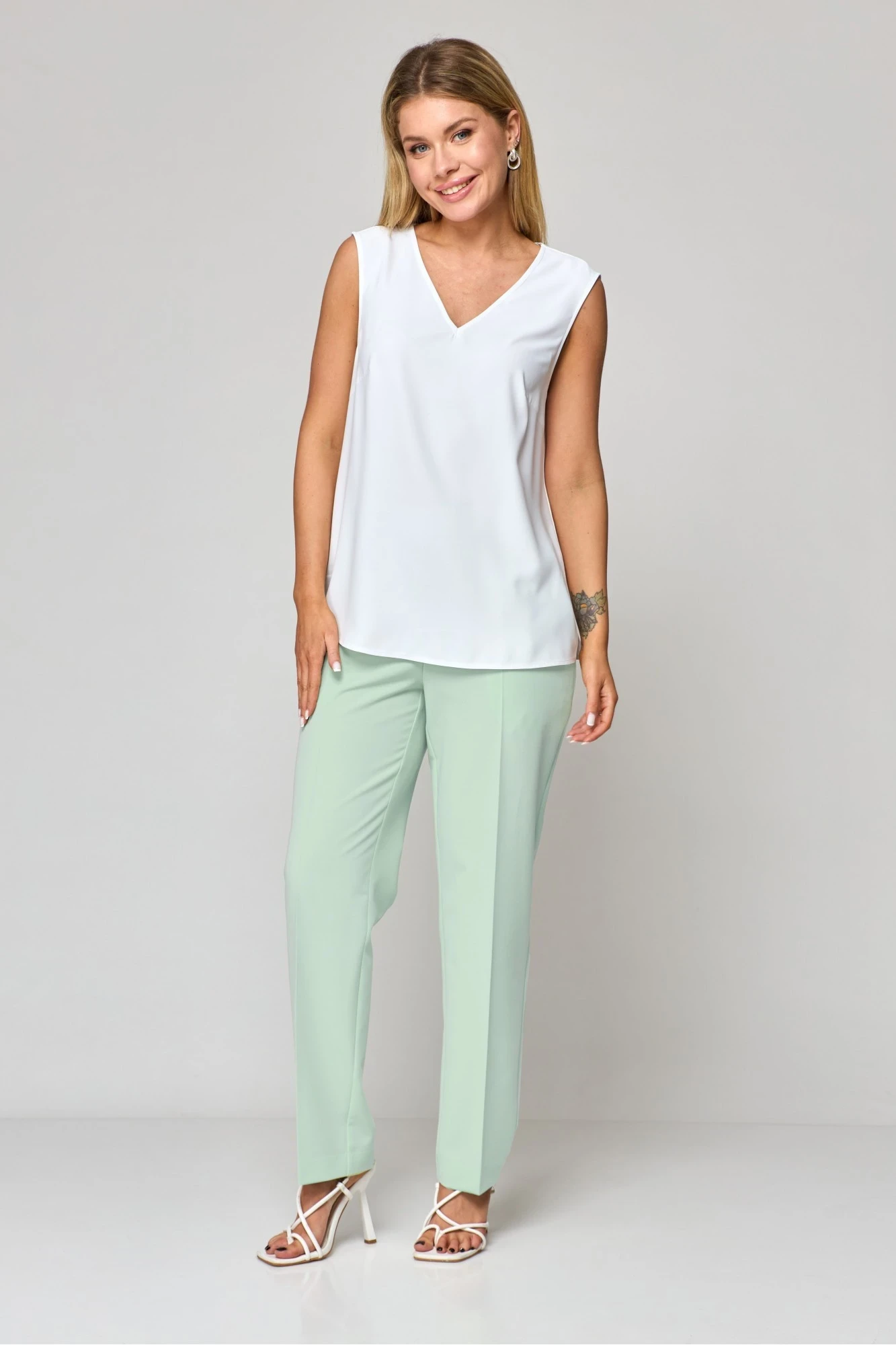 Блузка женская, полуприлегающего силуэта, длиной ниже линии бедер, без рукавов, с разрезами в боковых швах. Деталь переда блузки с нагрудными вытачками. Вырез горловины блузки «V-образной» формы.