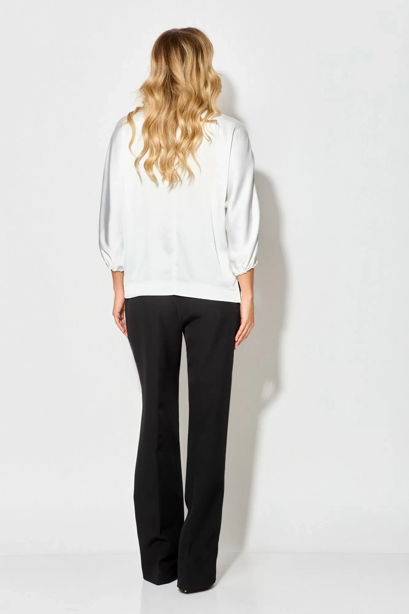 Блуза женская из атласной ткани, свободного силуэта, длиной до линии бедер, с цельнокроеными рукавами, в боковых швах обработаны разрезы, со съемным декоративным поясом. На детали переда блузы вверху слева нанесена аппликация-печать и прикреплены декоративные «камни». Деталь спинки со средним швом, вверху обработан разрез с застежкой на 1 пуговицу и навесную петлю. Рукава цельнокроеные, длиной 7/8, понизу вставлена эластичная тесьма. Вырез горловины округлой формы, обработан обтачкой.