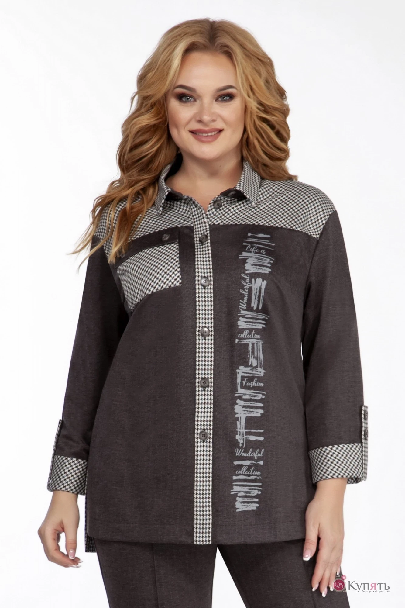 Комплект двухпредметный: жакет, брюки. Выполнен из плотного трикотажа с жаккардовым переплетением и текстиля. Жакет – рубашка средней длины, свободного силуэта, воротник на стойке, застежка по планке на пуговицы. Впереди – кокетка, с правой стороны – карман с клапаном и пуговицами. С левой стороны дизайнерская печать. Вытачки – нагрудные. Воротник, кокетка, карман и планка выполнены из текстиля. Спинка чуть ниже переда, со швом, выполнена из текстиля. По боковым швам – разрезы. Рукав ¾ с отворотом из текстиля, фиксируется патой на пуговицы, при желании рукав может быть длинным. Брюки слегка заужены, впереди кант зафиксирован строчкой. Брюки с высокой посадкой, оформлены притачным поясом с резинкой сзади, застежка «молния» + пуговица, по бокам карманы. Выполнены брюки из плотного трикотажа с жаккардовым переплетением. Учитывая пластичность ткани, комплект очень удобный и комфортный. Он хорош и для офиса, и для путешествий.