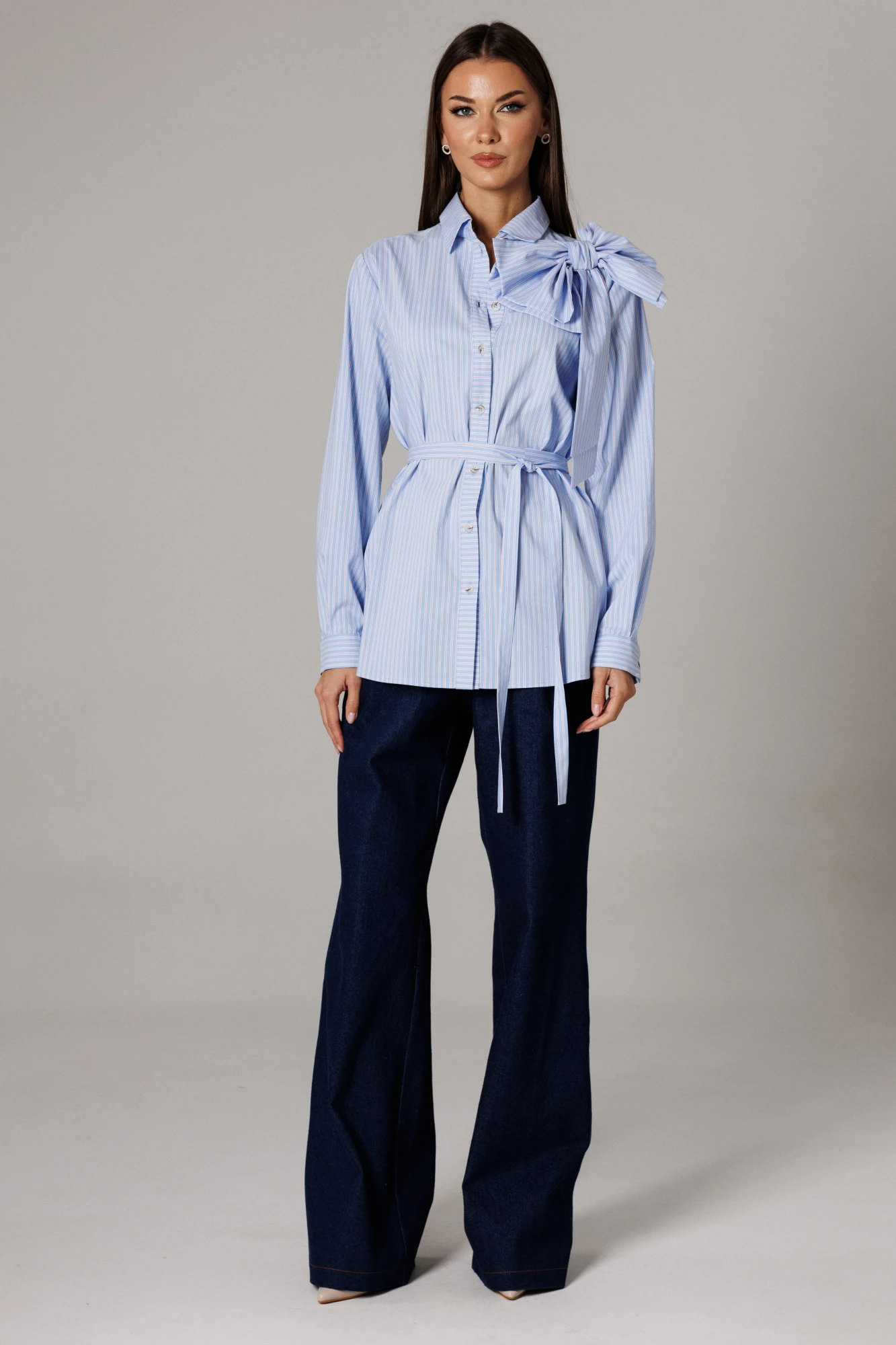 К рубашке присутствуют текстильные дополнения: пояс, брошь в виде банта.