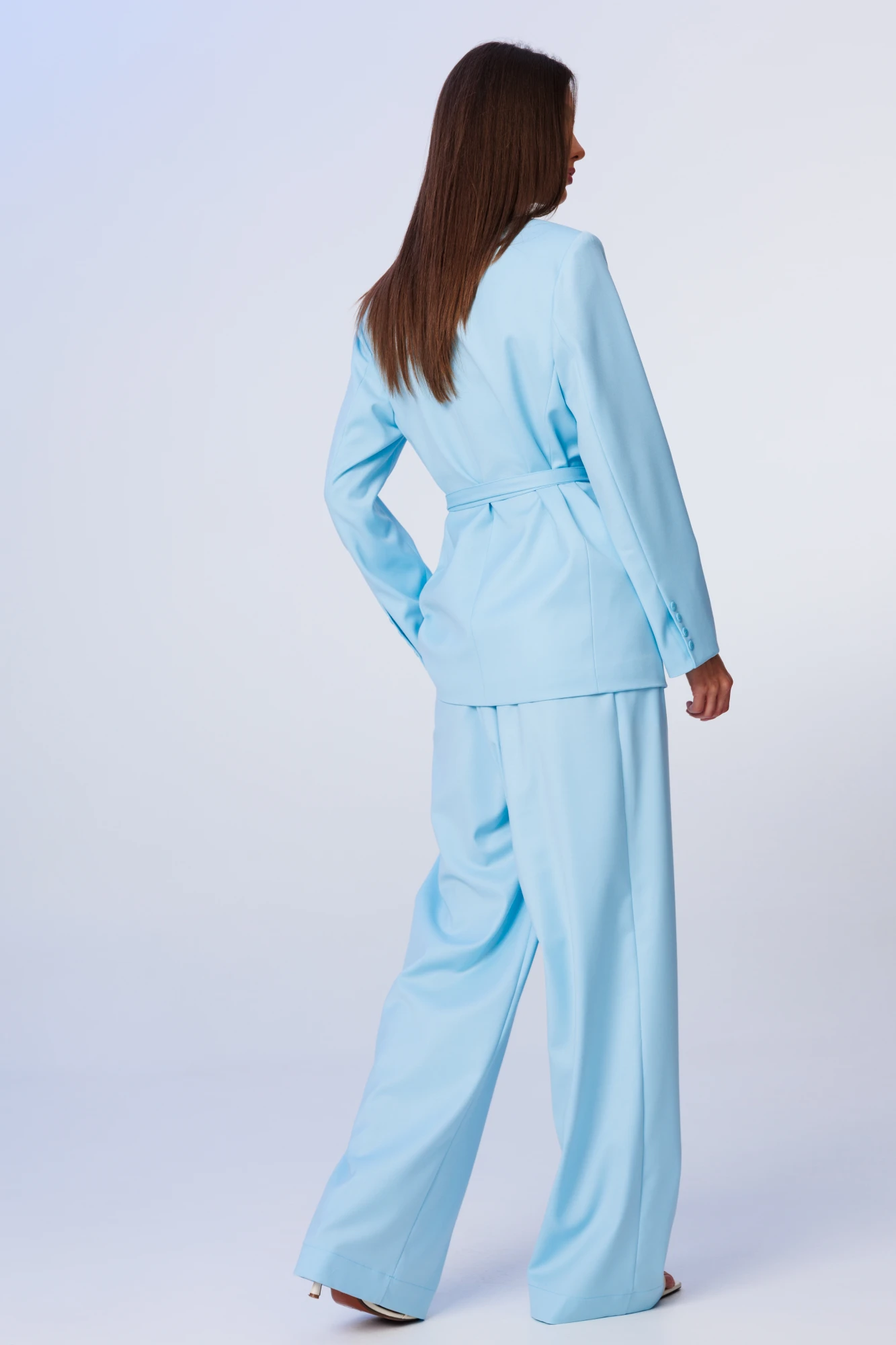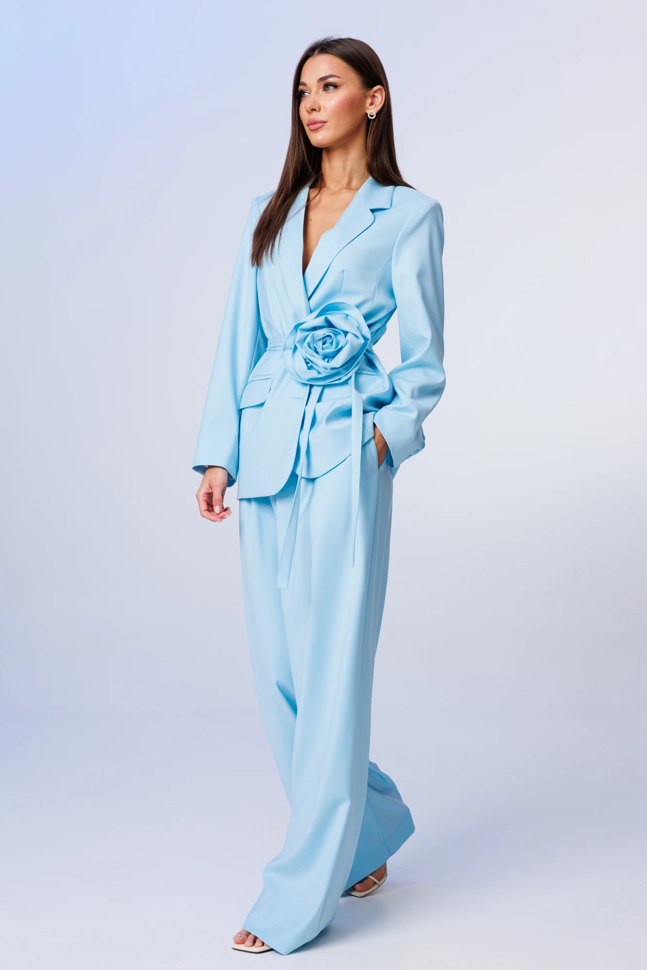 Стильный гармоничный комплект, состоящий из жакета и свободных брюк в стиле палаццо.