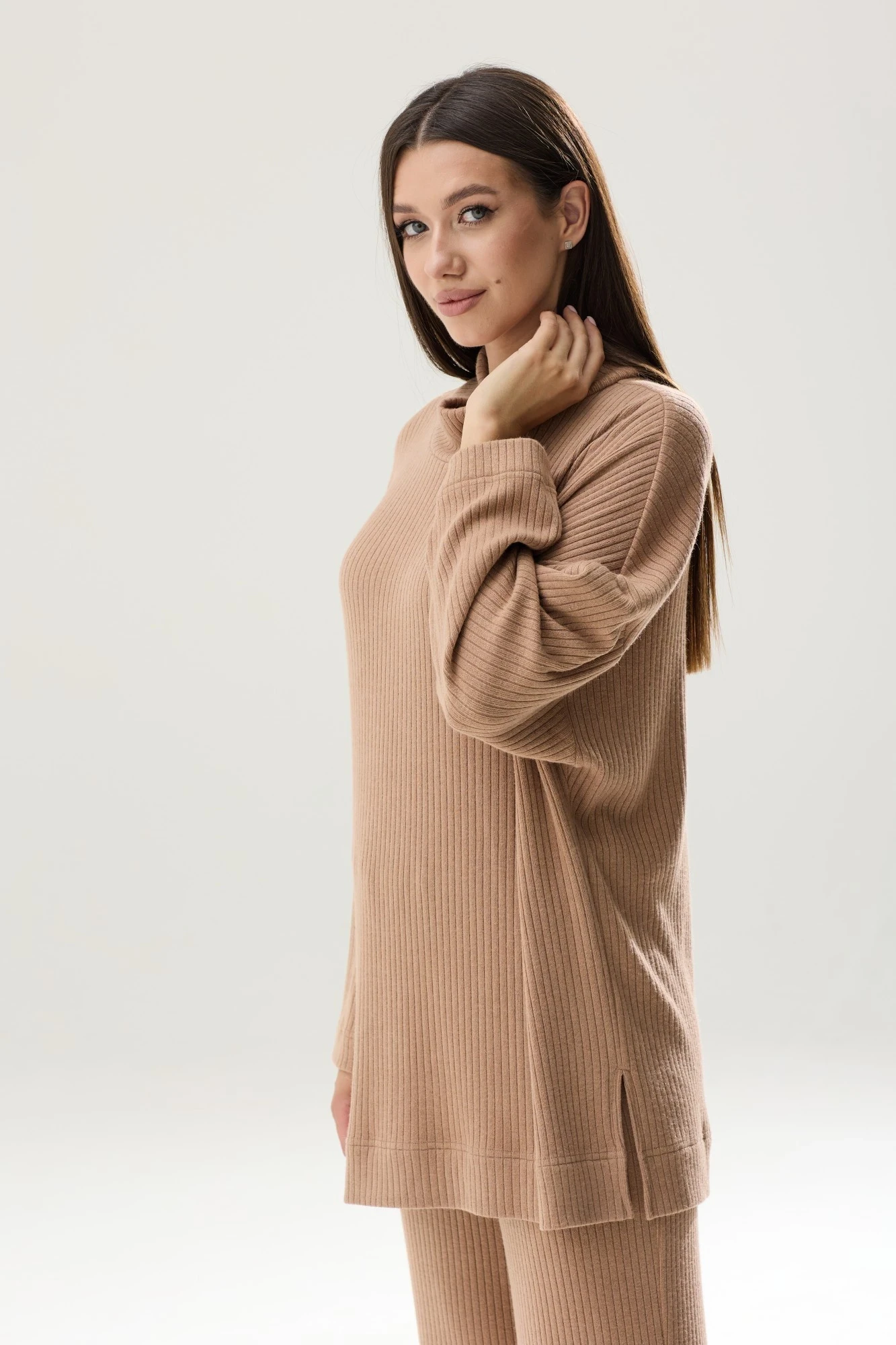 Ширина рукава 22-24 см, запястья 15 см. Длина от линии горловины до запястья 72-74см (в зависимости от размерного ряда). Боковые швы джемпера дополнены разрезами, высотой 15 см. Длина изделия по линии спинки 72.5-74 см (в зависимости от размерного ряда). Горловина джемпера оформлена стойкой с перегибом, высотой 8 см.