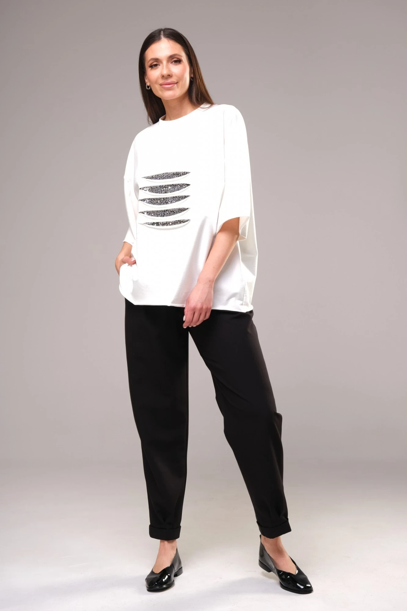 Актуальный комплект, состоящий из майки oversize с фронтальной вставкой из пайеток тон серебро и брюк современного покроя.