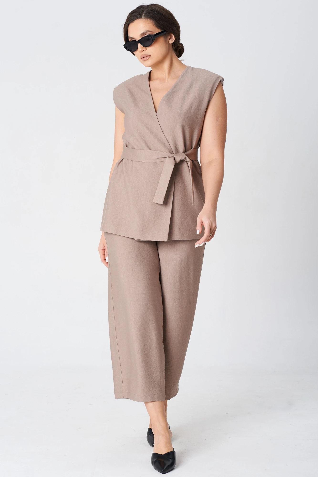 Комплект состоящий из жилета и укороченных брюк (кюлоты) Жилет на подкладке, прямого силуэта с увеличенной плечевой накладкой. Застежка двубортная на 2 петли и пуговицы. В комплект входит мягкий пояс из основной ткани. Брюки прямого покроя на прямом поясе с резинкой по спинке. Застежка на тесьму-молнию и пуговицу. По передним половинкам брюк функциональные карманы.