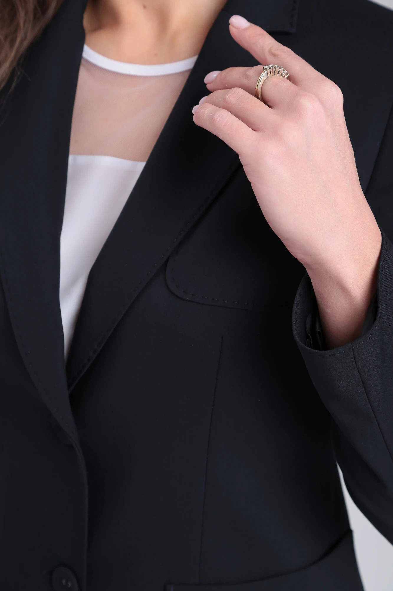 Комплект женский состоящий из жакета ,брюк и блузки. Жакет полуприлегающего силуэта на подкладке удлиненный. Перед с декоративными вытачками, спинка с рельефами. По переду фигурные функциональные накладные карманы. Воротник пиджачного типа, застежка центральная бортовая на петли и пуговицы. Рукав втачной двушовный длинный. Брюки на притачном поясе зауженные к низу, застегивающиеся на петлю и пуговицу. По переду карманы-хулиганы, сзади карманы отсутствуют. Отделкой является отделочная строчка имитация ручного стежка. Блузка женская полуприлегающего силуэта с нагрудными вытачками без рукава. По переду и спинке кокетки из сетки. Пройма и горловина на окантовке.
