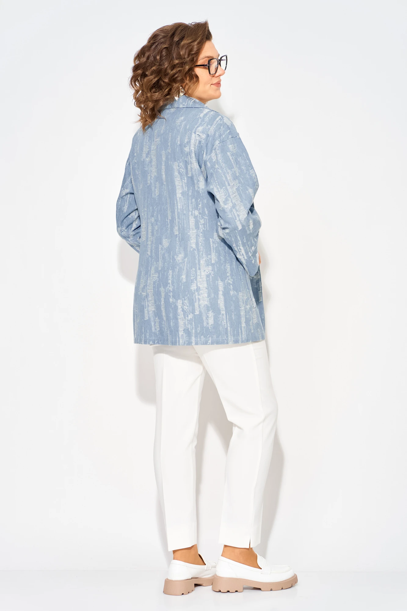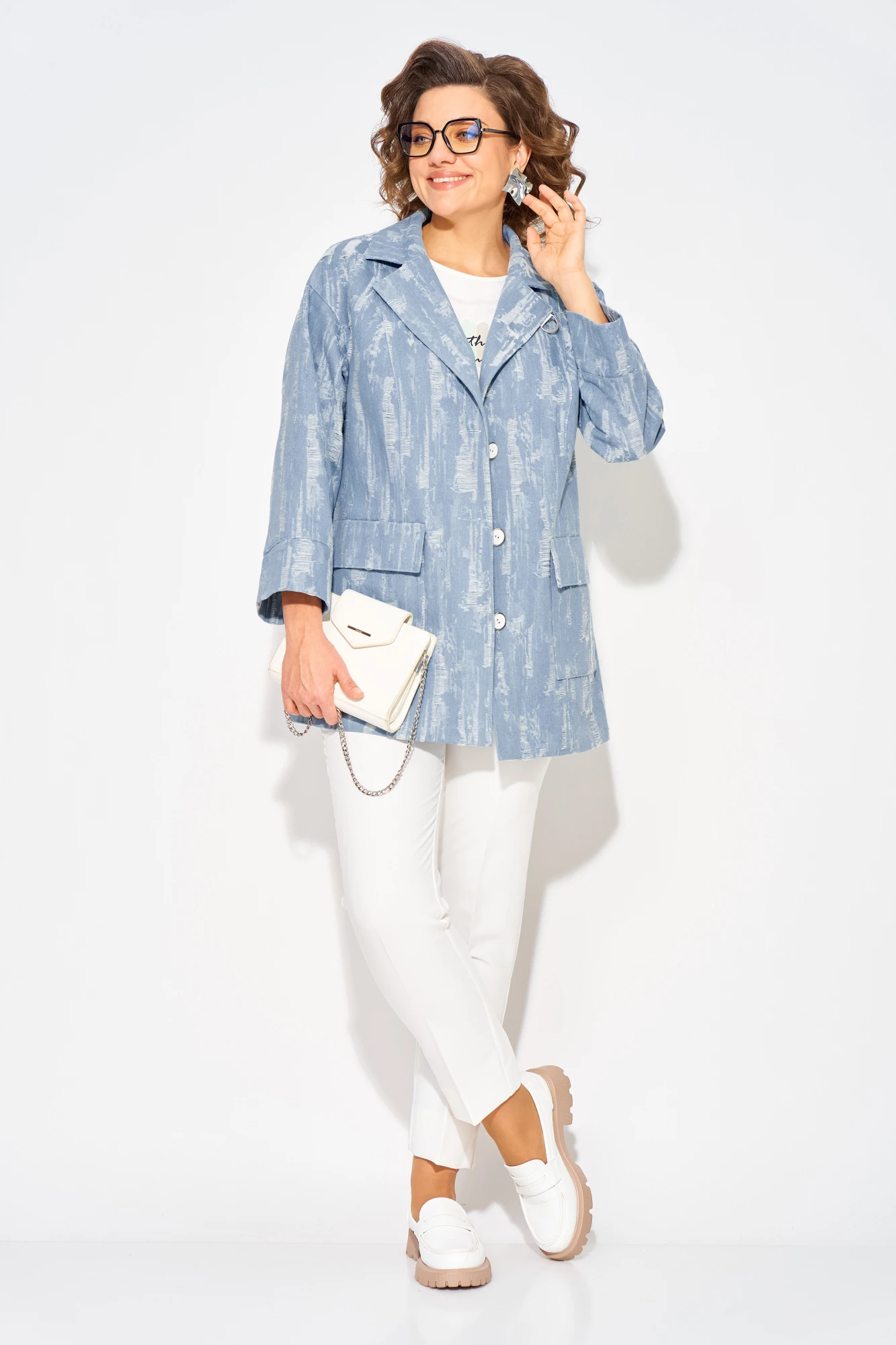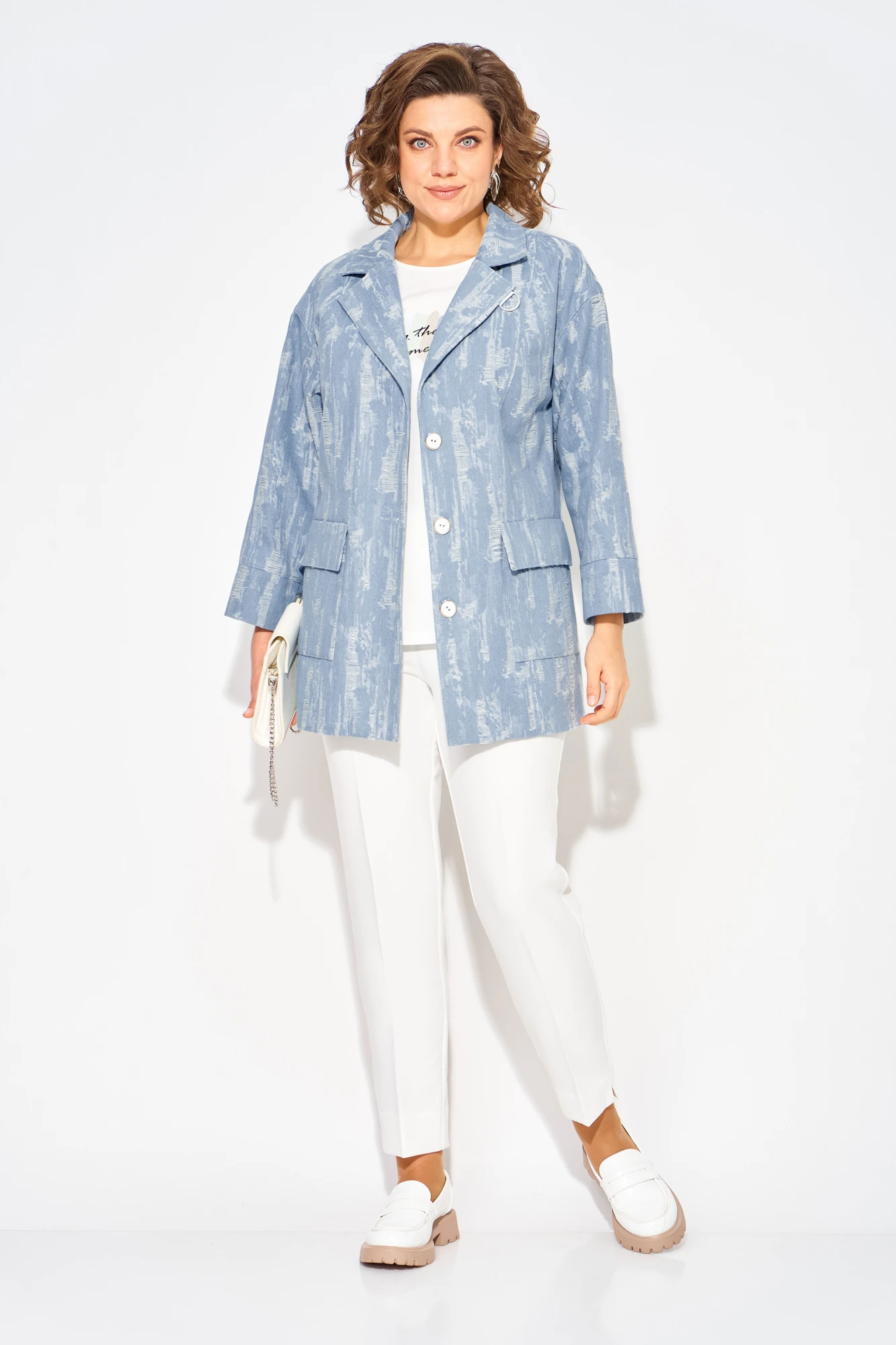 Джинсовый женский жакет идеальный выбор для создания стильного весенне-летнего образа 2026 года. Современный, светлый дизайн с эффектом гранжа придает свою изюминку изделию. Модель свободного силуэта, на спущенном плечевом поясе. Воротник отложной, английского типа с подбортом. Застежка центральная на петли и пуговицы. По полочке и спинке расположены продольные рельефы для комфортного прилегания. Спереди расположены накладные карманы с клапаном.