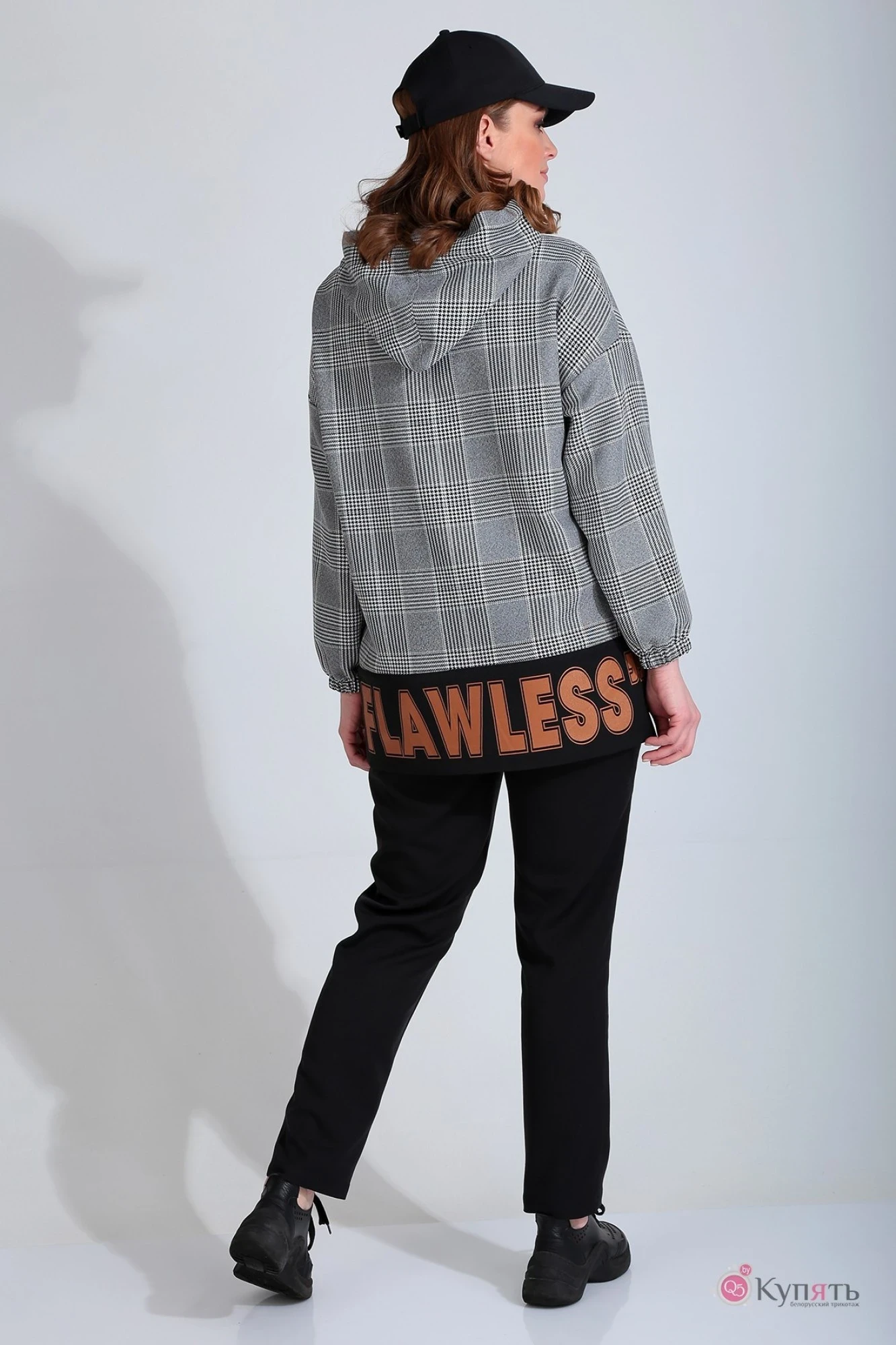 Костюм женский в стиле «спорт-шик» состоящий из джемпера и брюк. Джемпер прямого силуэта, со спущенной линией плеча. Низ рукавов джемпера на резинке. По низу спинки джемпера отрезная деталь с печатью. Горловина обработана капюшоном, состоящим из двух частей. В отлет капюшона вставлены блочки и декоративный шнур. Брюки зауженные к низу. На передних половинках брюк боковые карманы «хулиганы». Верхний срез брюк на притачном поясе на резинке с тесьмой из основной ткани.