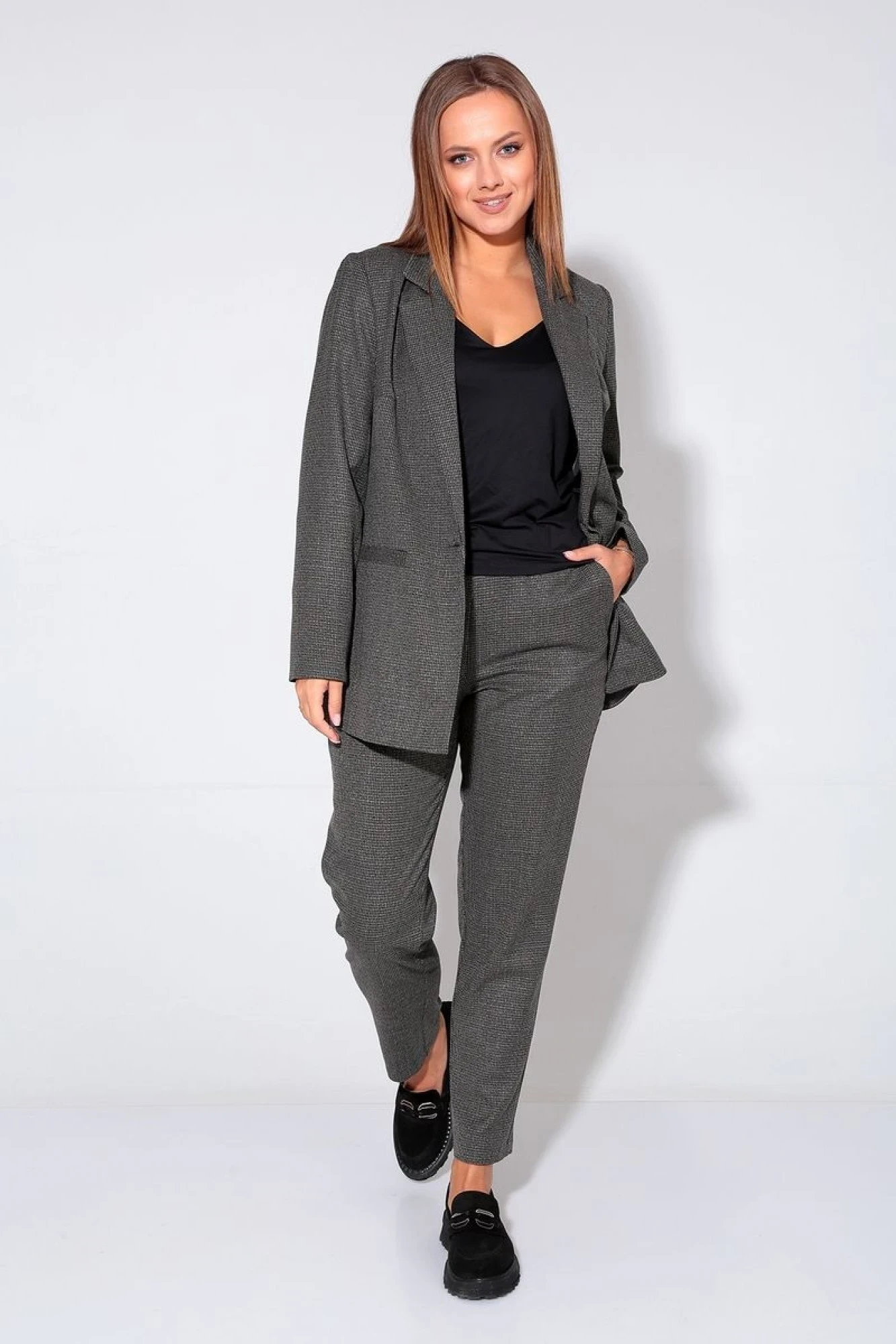 Жакет прямого силуэта. Перед жакета с отрезными бочками и нагрудными вытачками. По полочкам жакета расположены прорезные карманы с листочкой. Спинка жакета со средним швом. Воротник пиджачного типа с отложными лацканами с центральной застёжкой на одну пуговицу. Рукав втачной двух шовный. Жакет на подкладке. Брюки зауженные к низу. На передних половинках брюк боковые карманы «хулиганы». Верхний срез брюк на притачном поясе на резинке со шнуром.